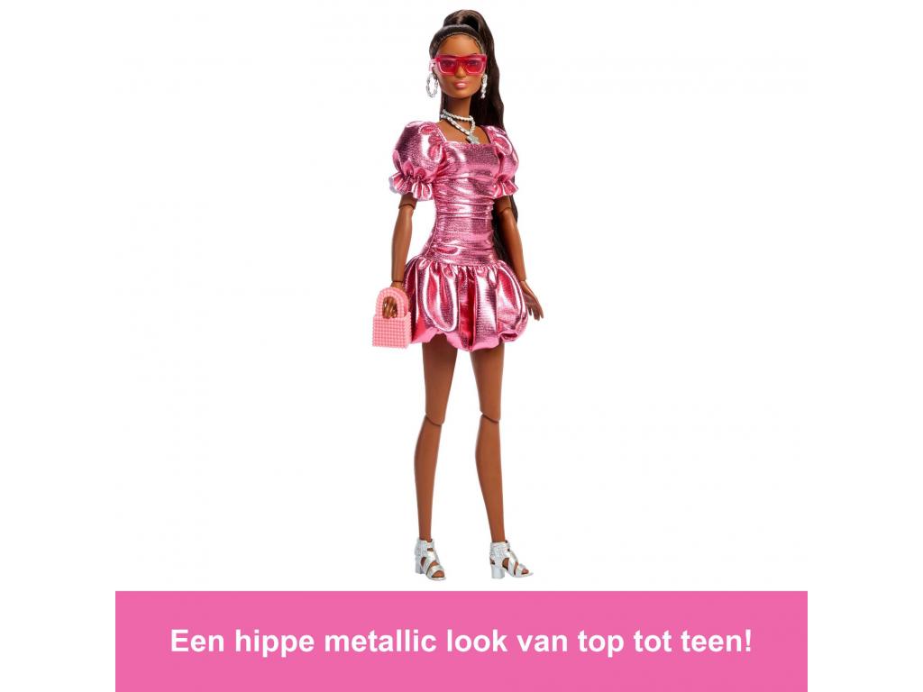 Barbie Fashion Deluxe szett babával, és fémesen csillámos, extravagáns ruhával. Mozgatható végtagok. 3 éves kortól alkalmas.