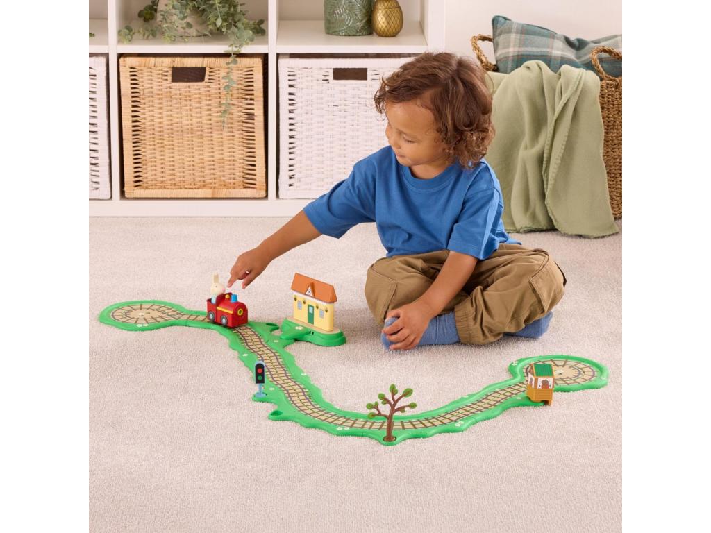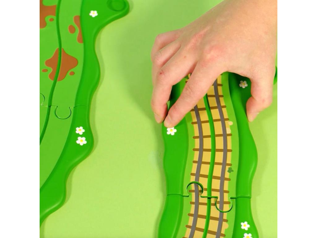 Egészítsd ki ezt a 14 darabból álló kattogó vonatszettet a mellékelt kiegészítőkkel, mint például Mr. Stier jelzőházikója, egy jelzőlámpa, fa és az interaktív vasútállomás.