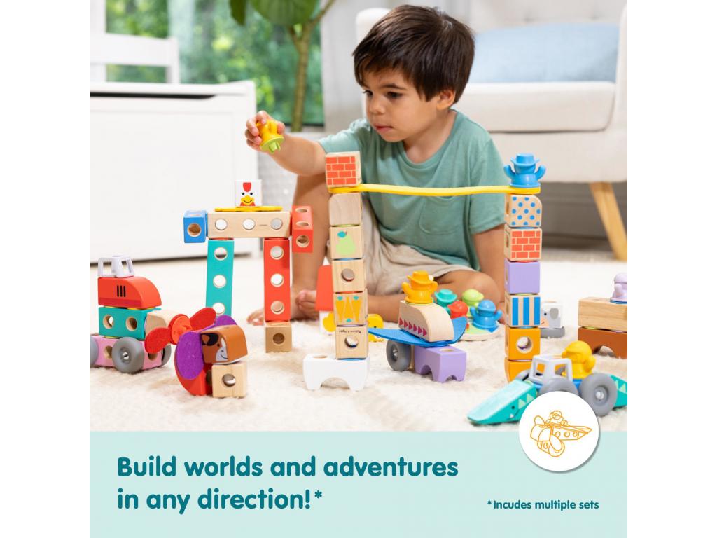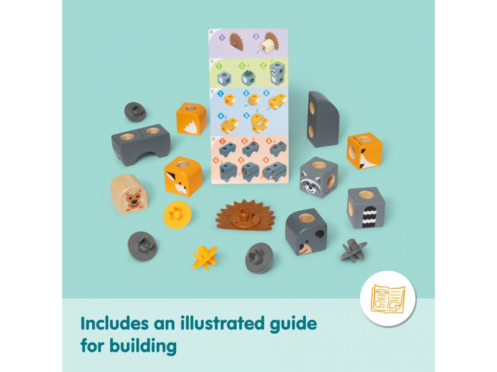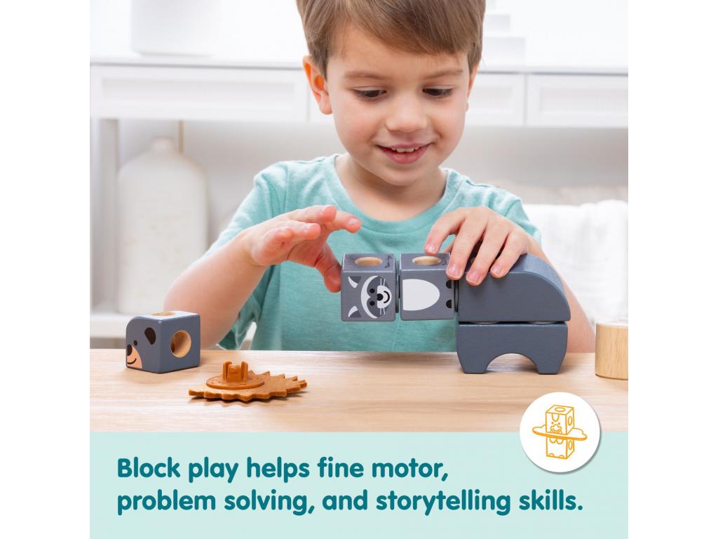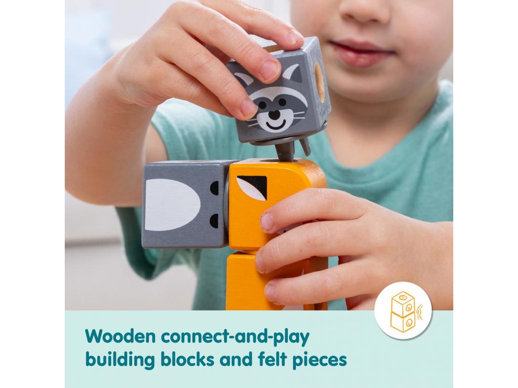 Ez a játékkészlet tartalmaz: 9 tömörfa blokkot (FSC-tanúsítvánnyal), 6 összekötő darabot és filc kiegészítőket. Kompatibilis a Blockables sorozat összes darabjával, blokkjával és játékelemével.