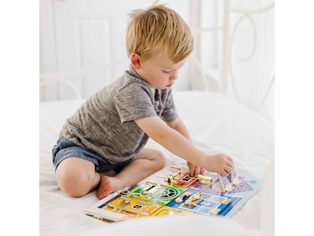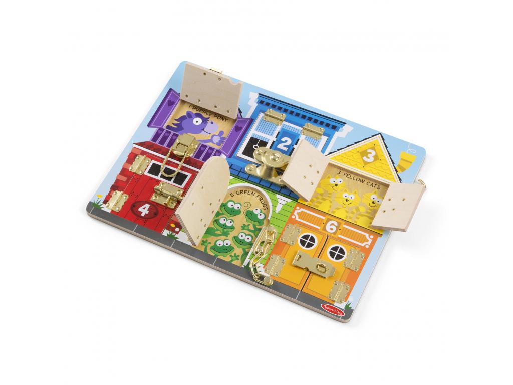 Oktatási célú fa tábla különböző záróelemekkel. Serkenti a finom motorikus képességeket és a problémamegoldó gondolkodást. 3 éves kortól alkalmas. MDT motorikus táblák zárak A gyerekek természetüknél fogva kíváncsiak, kipróbálni és megérteni akarnak mindent. Minden, ami sikerül nekik, erősíti az önbizalmukat és felkészíti őket a következő kihívásra. A Melissa & Doug motorikus táblák zárak és reteszek pontosan ezeknek a kis felfedezőknek kínálnak játékos tanulást különböző szinteken. Egyrészt fejleszti a finommotorikát és az ügyességet, valamint az ok-okozati összefüggések megértését. A tábla hat különböző reteszt tartalmaz, amelyek kihívást jelentenek a gyermekek számára, mivel megtanulják, hogyan kell beakasztani, becsukni, becsapni és elcsúsztatni. A mindennapi életben rendkívül fontos az a képesség, hogy tudjuk kinyitni és bezárni a dolgokat. A következő szint a számok és mennyiségek megértése, amelyet itt játékos módon tanítanak. Minden zár egy ablakhoz vagy ajtóhoz és egy számhoz kapcsolódik, valamint a mögötte rejtőző megfelelő számú állathoz. A tábla a színek tanulásához is lehetőséget kínál. A fa tábla és a fém zárak kiváló minőségű kivitelezésének köszönhetően a motorikus tábla óvodákban és napközikben is használható, vagy átadható testvéreknek. A Melissa & Doug márka emellett széles választékot kínál fából és kiváló minőségű műanyagból készült szerepjátékokból, valamint puzzle-kből, fa építőelemekből és egyebekből. Tartalom: * 1 fa motorikus táblázat 6 fém zárral Méretek: 39,88 x 29,46 x 1,02 cm