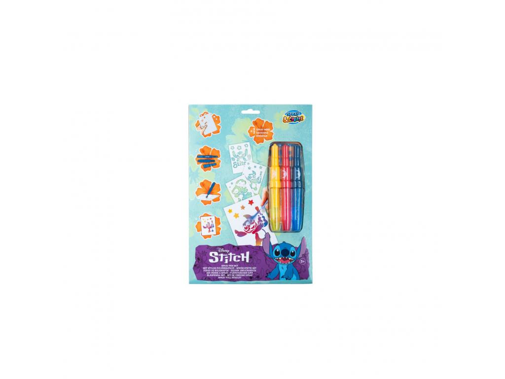A készlet 3 spray tollat tartalmaz piros, sárga és kék színben, valamint 3 újrahasznosítható sablont Stitch figurákkal, gyönyörű alkotások készítéséhez.