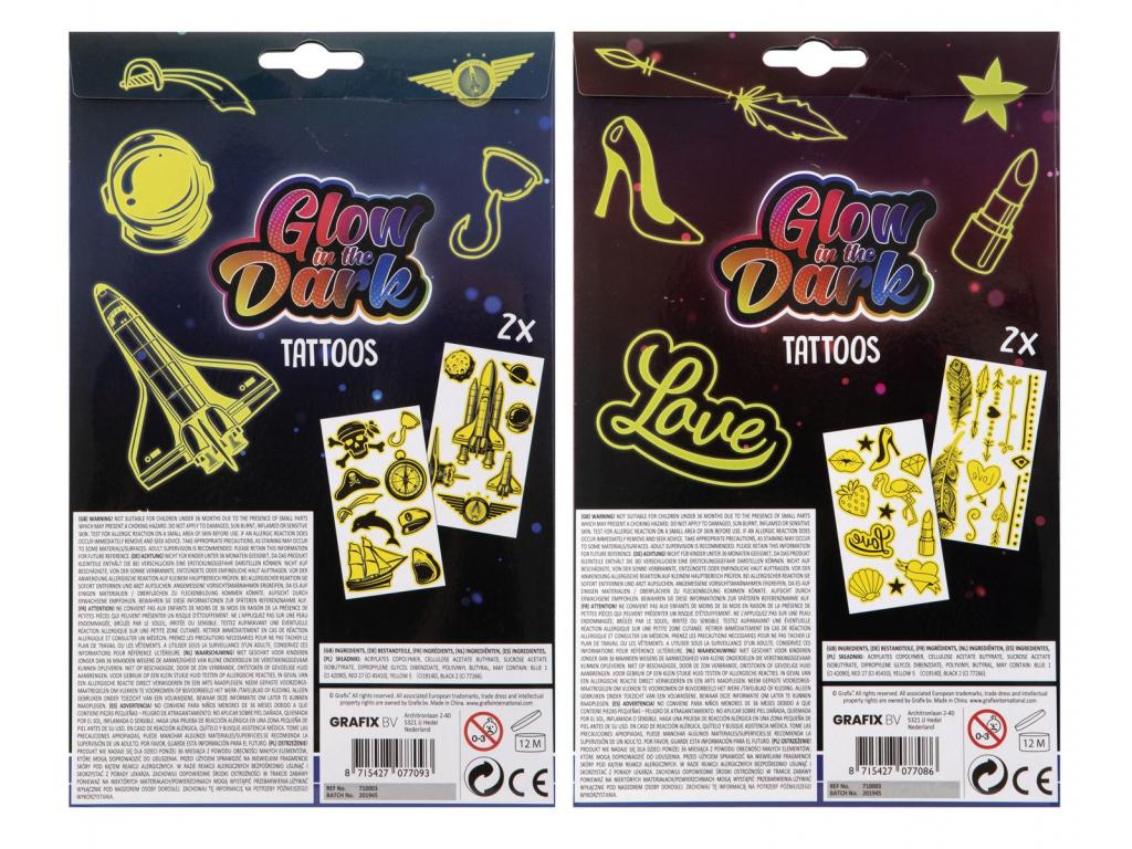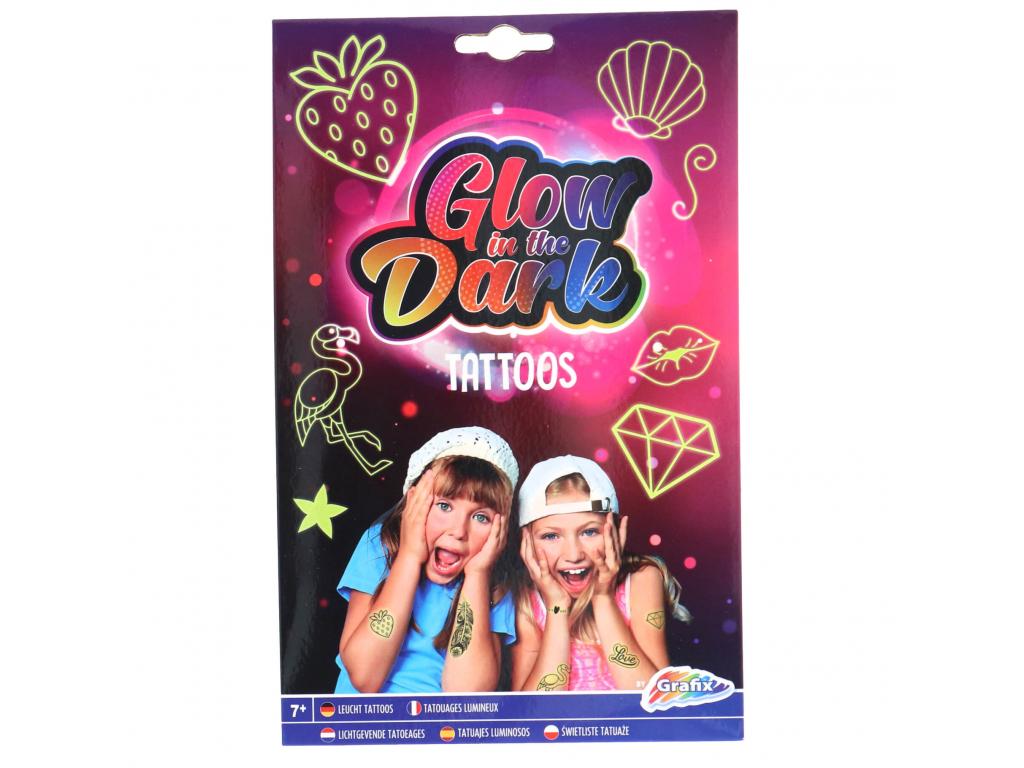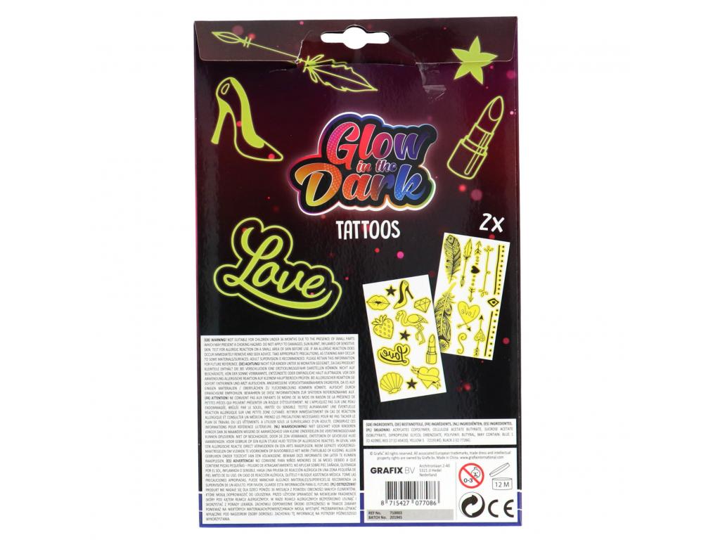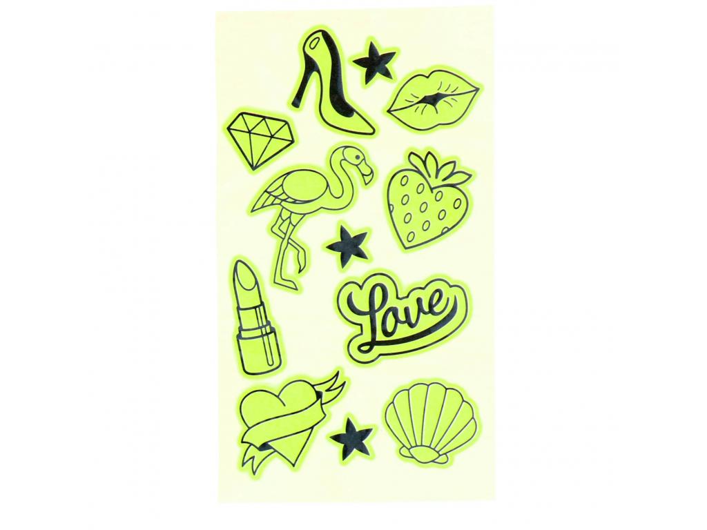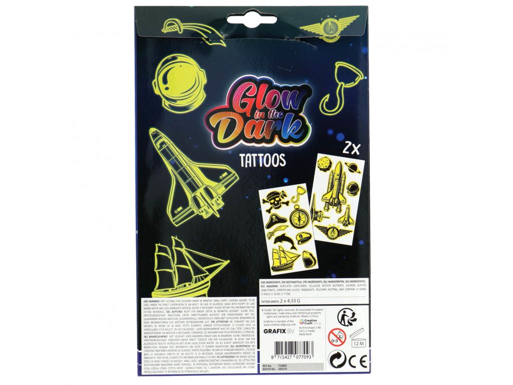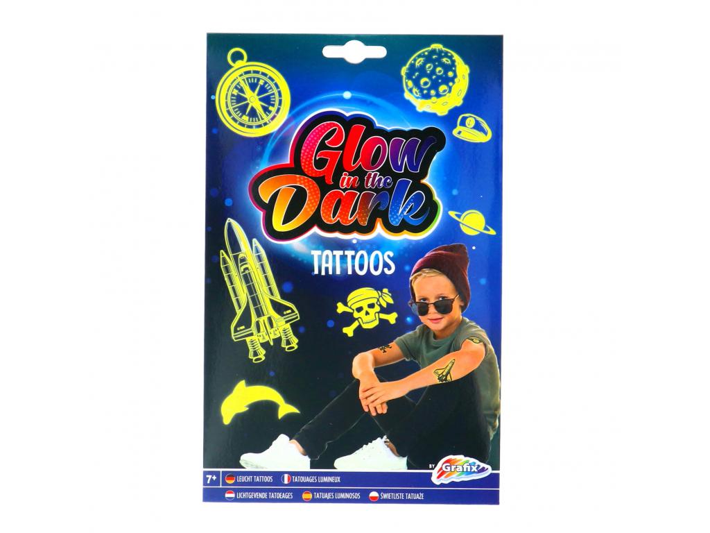 Glow In The Dark Tattoo. Menő, sötétben világító tetoválások! Nedves ruhával könnyen felvihető. 7 éves kortól ajánlott. Többféle változatban kapható, szállítás véletlenszerűen.