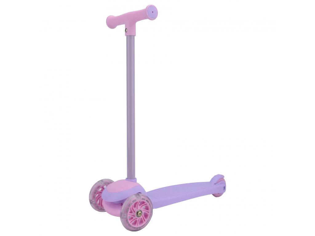 Alert háromkerekű roller két első kerékkel és egy hátsó kerékkel. Magasságában állítható kormány. Fémből és műanyagból készült. 3 éves kortól alkalmas. Szín: rózsaszín/lila.