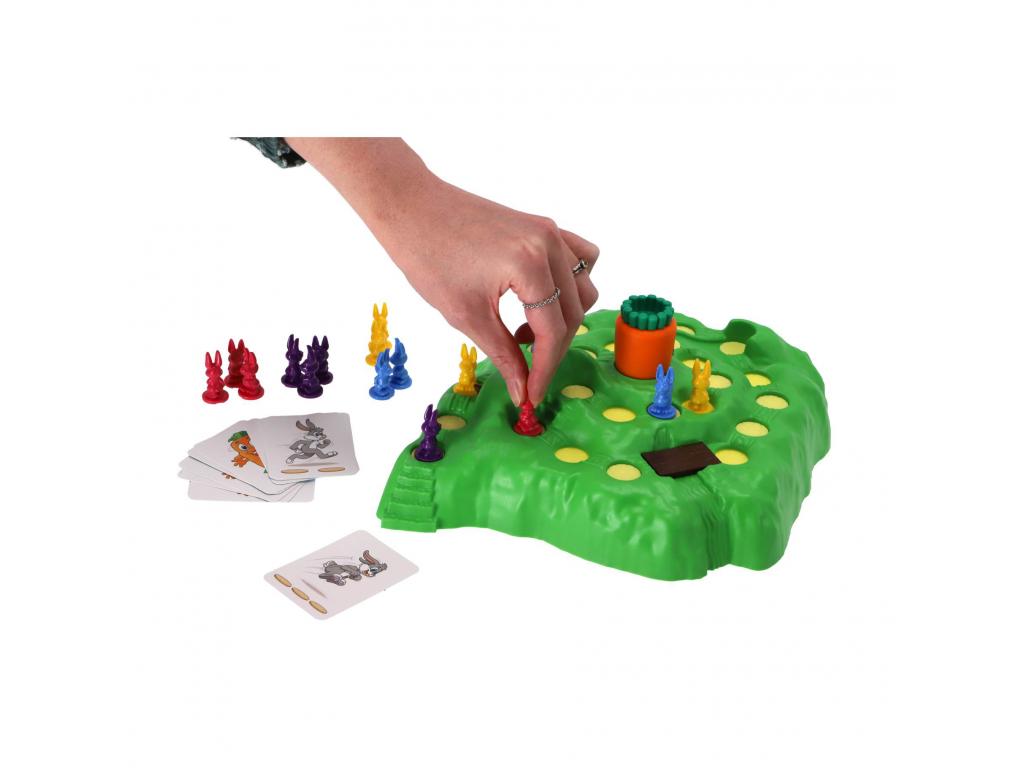 Teljesen őrült nyúlverseny 24 játékos számára, 499 éves korig! Kicsi nyulaink versenyeznek a hegy tetején lévő zamatos répáért. De az út tele van meglepetésekkel: egyszer lyukak nyílnak az úton, és plop az egyik nyúl beleesik, máskor egy okoskodó vakond durván ledobja őket a tábláról. Egy felvonóhíd és egy kerítés is elzárja az utat a nyulak előtt. Aki elsőként éri el a répát, megnyeri ezt a vidám Ravensburger játékot! Holland nyelvű változat!