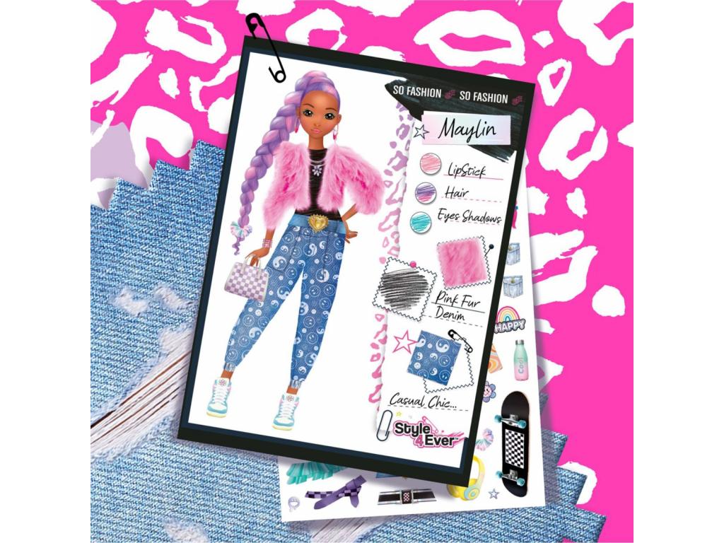 1 divatstúdió, 20 színes modell, 3 sablon, 6 színes ceruza, 5 csík öntapadó szövet, 10 lap mintás papír, 6 tekercs mintás papír, 2 lap matrica, 1 dupla hegyű filctoll, 1 tubus ragasztó, 50 strassz, 1 útmutató. Többféle változatban kapható, szállítás véletlenszerűen.