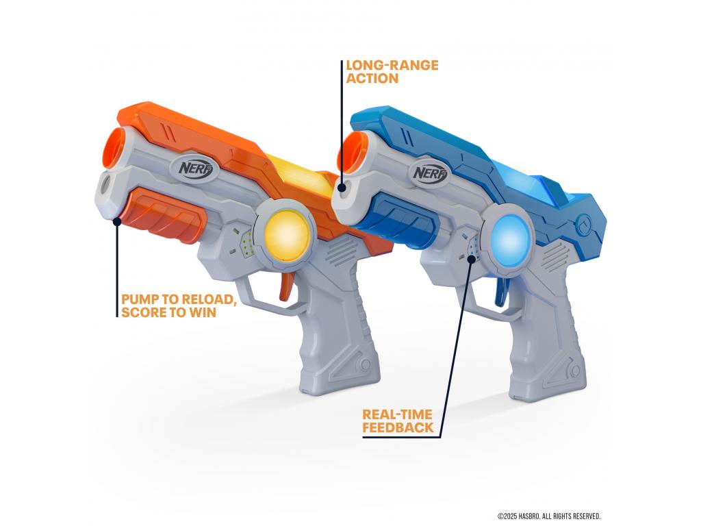 2 db fény-és rezgő effektes Nerf pisztoly, tökéletes 2 személyes szivacslövő csatákhoz. Az elemeket nem tartalmazza. További pisztolyokkal bővíthető.
