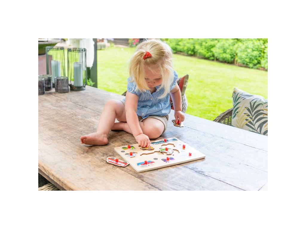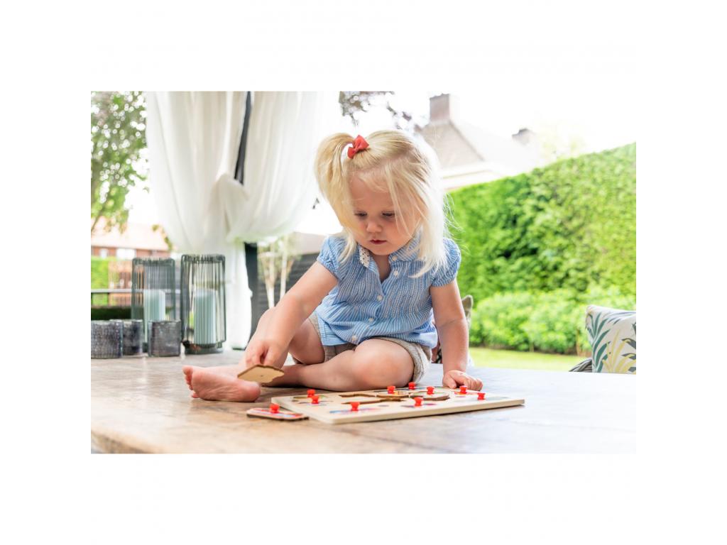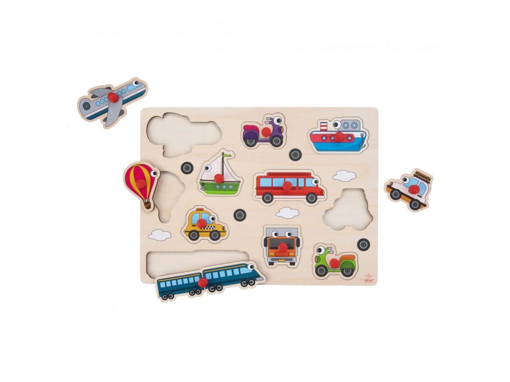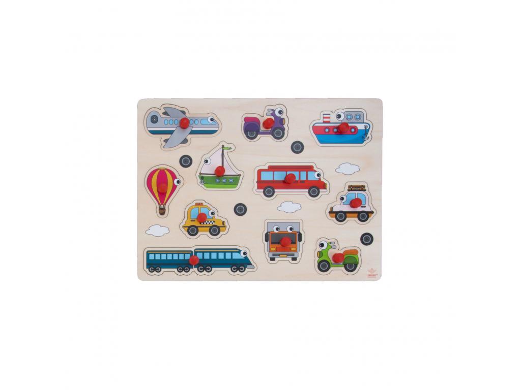 Fa gombos puzzle járművekkel, amely egy stabil puzzle táblából és 8 darabból áll. Minden puzzle darabon egy fa gomb található, amely megkönnyíti a fogást. 2 éves kortól alkalmas.