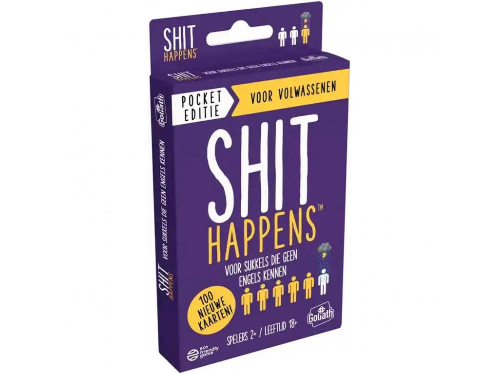 Zsebkiadás a híres 18+ társasjátékból, a Shit Happensből. A Shit Happens egy vicces és visszataszító, de élethű társasjáték. Különféle kellemetlen helyzetekkel találkozol, amelyeket rangsorolnod kell a fájdalom skálán, amely 1-től 100-ig terjed. Mi a rosszabb? Látni az apádat meztelenül vagy minden éjjel bepisilni az ágyba? Gyűjts össze 10 szerencsétlen kártyát, és nyerd meg a játékot! Holland nyelvű játék.