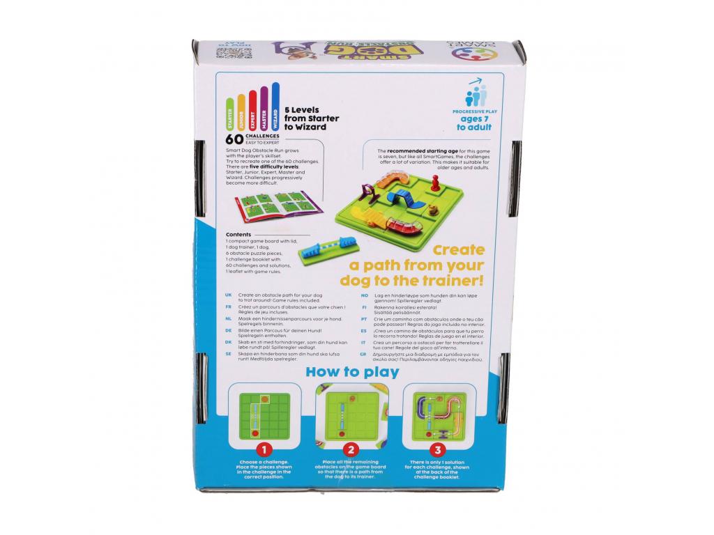 Smart Dog - Gondolkodós játék. Készíts akadálypályát kutyádnak ebben a kihívásokkal teli puzzle játékban. Képes vagy kijelölni egy utat a kutyától a trénerig? 60 kihívás növekvő nehézségi fokozattal. 7 éves kortól 1 játékos számára alkalmas. Angol/német/francia nyelven.