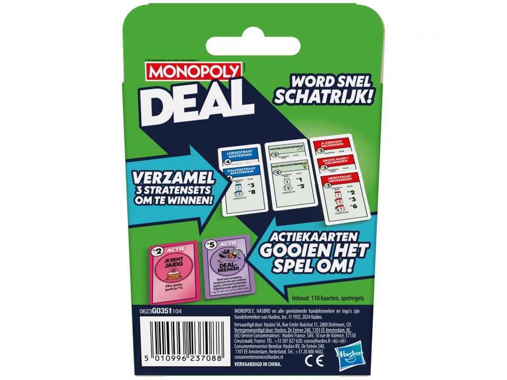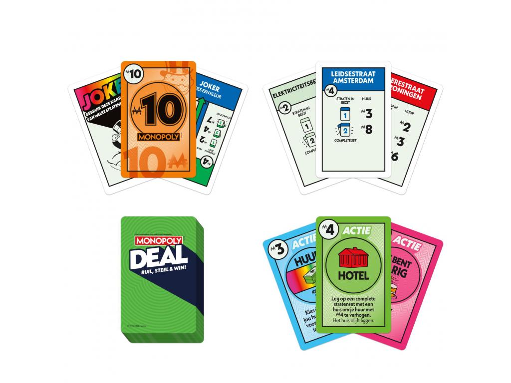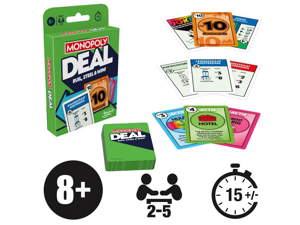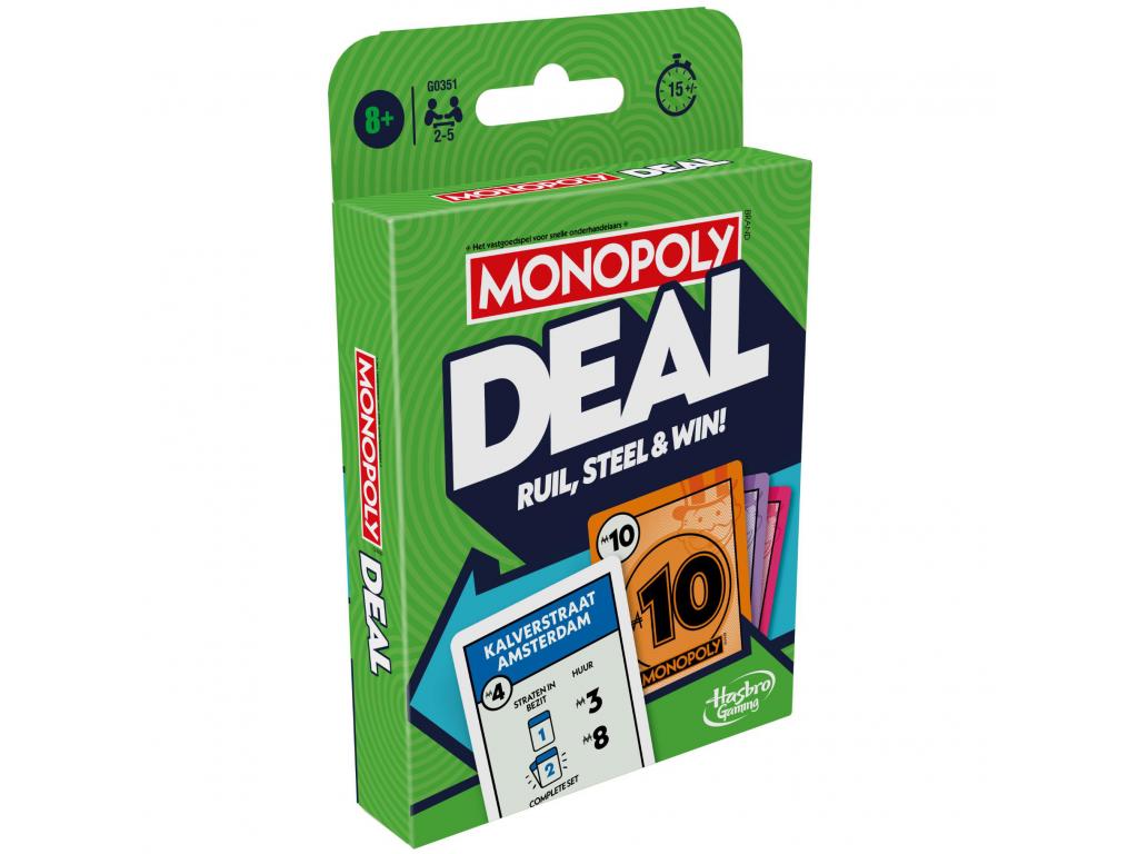 MONOPOLY DEAL KÁRTYAJÁTÉK. A Monopoly Deal kártyajáték a klasszikus játék gyorsabb változata, amelynek játékideje körülbelül 15 perc. Ez a kártyajáték az eredeti Monopoly Deal frissített változatát tartalmazza, új kártyákkal és lehetőségekkel.