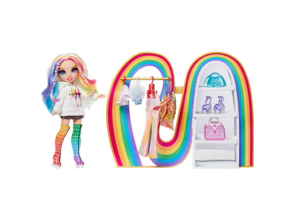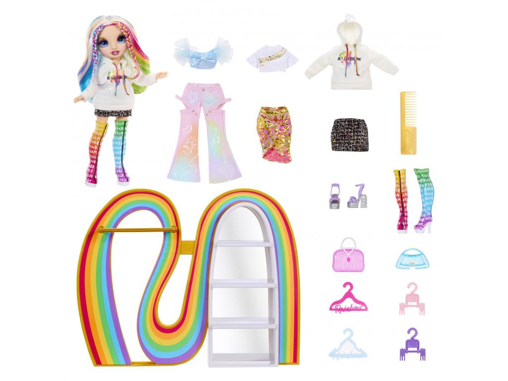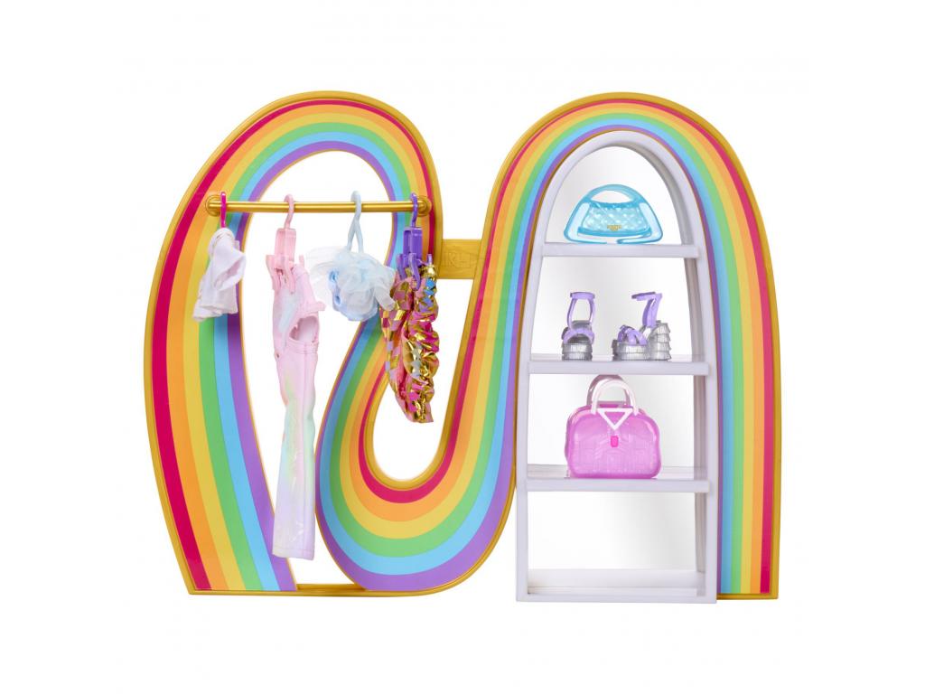 RAINBOW CLOSET JÁTÉK SZETT. Tartalmaz egy exkluzív Amaya babát, ruhaakasztót, vállfákat, többszintű polcokat, valamint további ruhákat, cipőket és táskákat.