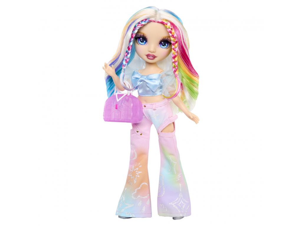 EXKLUZÍV BABÁK. Amaya tetőtől talpig a jellegzetes RAINBOW ruhájában van. Hosszú, fésülhető haja szivárványcsíkokkal tarkított.