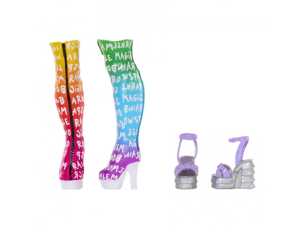 A CSOMAG TARTALMA. Exkluzív, mozgatható divatbaba, szekrény szivárványos fallal, ruhaakasztó, 4 emeletes cipőpolc, 6 divatcikk, 3 pár cipő, 2 kézitáska, 4 akasztó, 1 fésű.