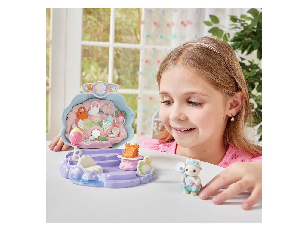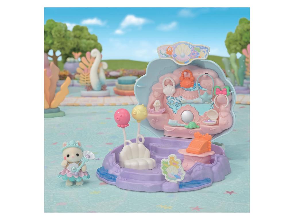 A Sylvanian Baby Mermaid Shop készlet tartalmaz egy kagyló alakú boltot, tengeri témájú kiegészítőket és egy selyem macskababát. A kiegészítők kiállíthatók a boltban vagy a baba viselheti őket. Ha a bolt zárva van, kagylós motívumú hordtáskává alakul, és a baba kerül a középpontba! Nyisd ki a kagylót, és készülj fel a vásárlók fogadására a sellőboltban. Ha minden kiegészítő ki van állítva, ideje megnyitni! Ha a játékidő lejárt, csukd be a boltot a kagyló bezárásával. A figura és az összes kiegészítő a kagylóbolti táskában tárolható, amely hordtáskává alakul. A selyem macska baba sellő hercegnő jelmezt visel. Viselheti a kiegészítőket és tarthatja a lufikat.