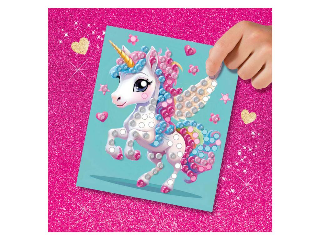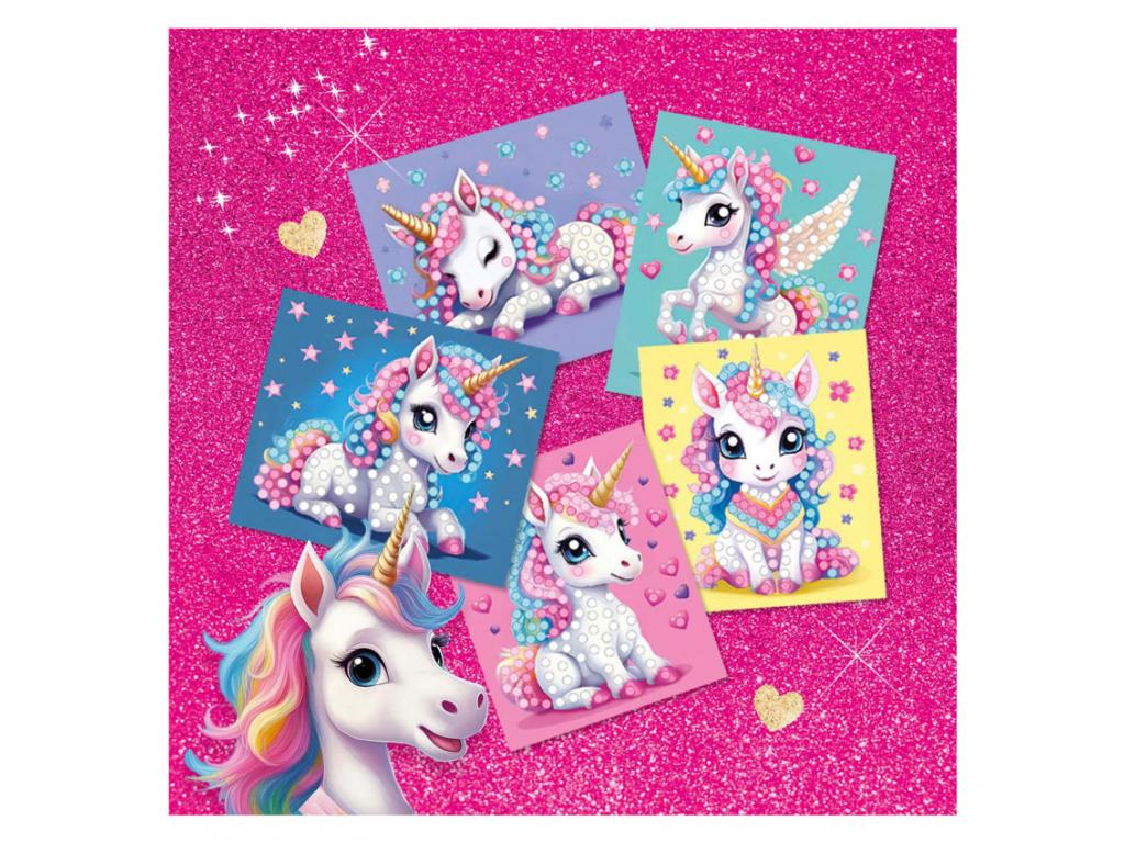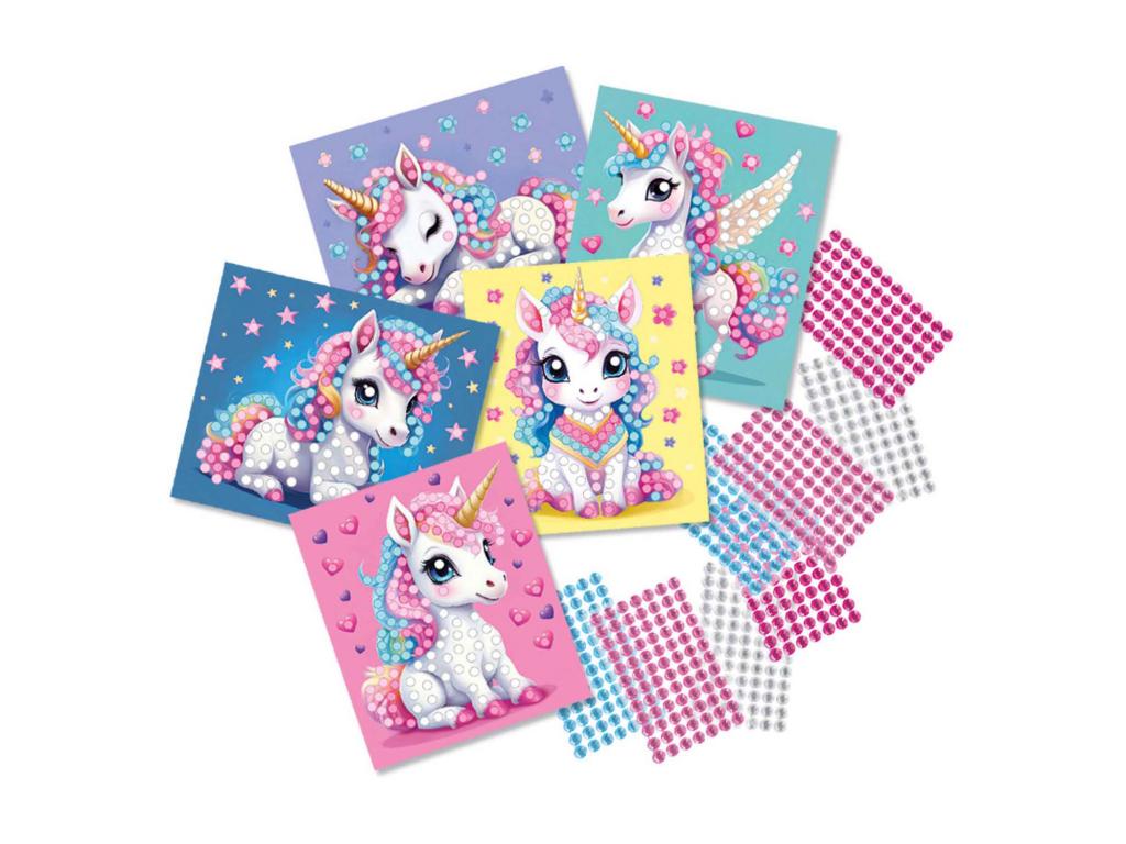 Fedezd fel az egyszarvúak varázslatos világát gyémántfestéssel! Díszíts öt gyönyörű egyszarvú kártyát négy ragyogó színű öntapadó gyémánttal. A gyémánt matricák megfelelő helyre ragasztásával csillogó műalkotások jönnek létre, amelyek tökéletesen alkalmasak felakasztásra vagy ajándékozásra. Ez a kreatív tevékenység fejleszti a finom motorikus képességeket és órákon át tartó kézműves szórakozást nyújt mindazoknak, akik szeretik az egyszarvúkat és a csillogó dekorációkat!