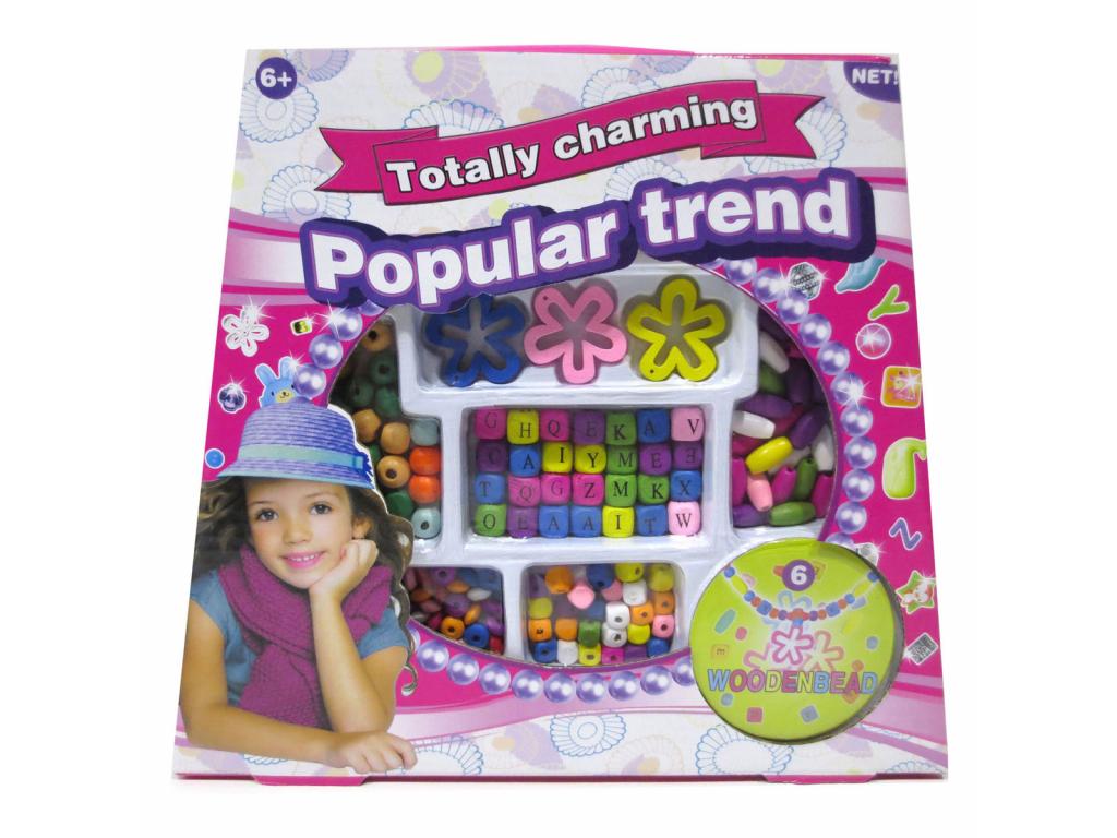 Gyöngy készlet különböző formájú és színű fa gyöngyökkel: nagy virágok, betűgyöngyök, kerek gyöngyök, hosszúkás gyöngyök és még sok más! 6 éves kortól alkalmas.