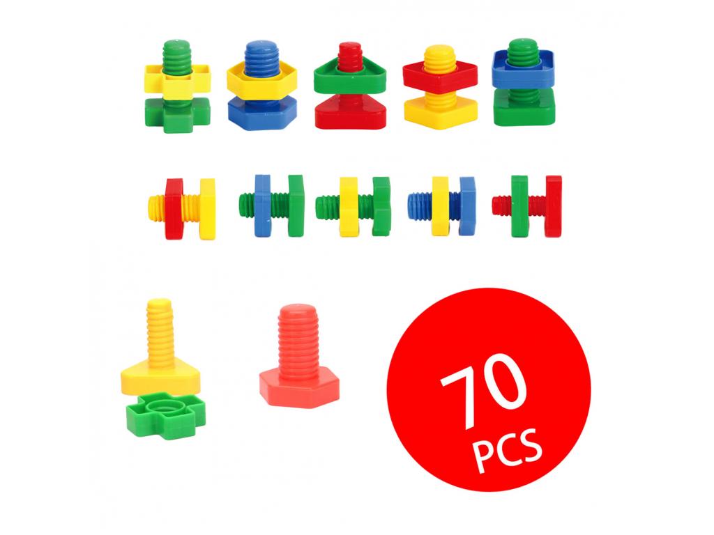 Tárolódoboz 70 színes csavarral és anyával. 3 éves kortól alkalmas.