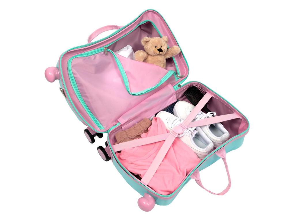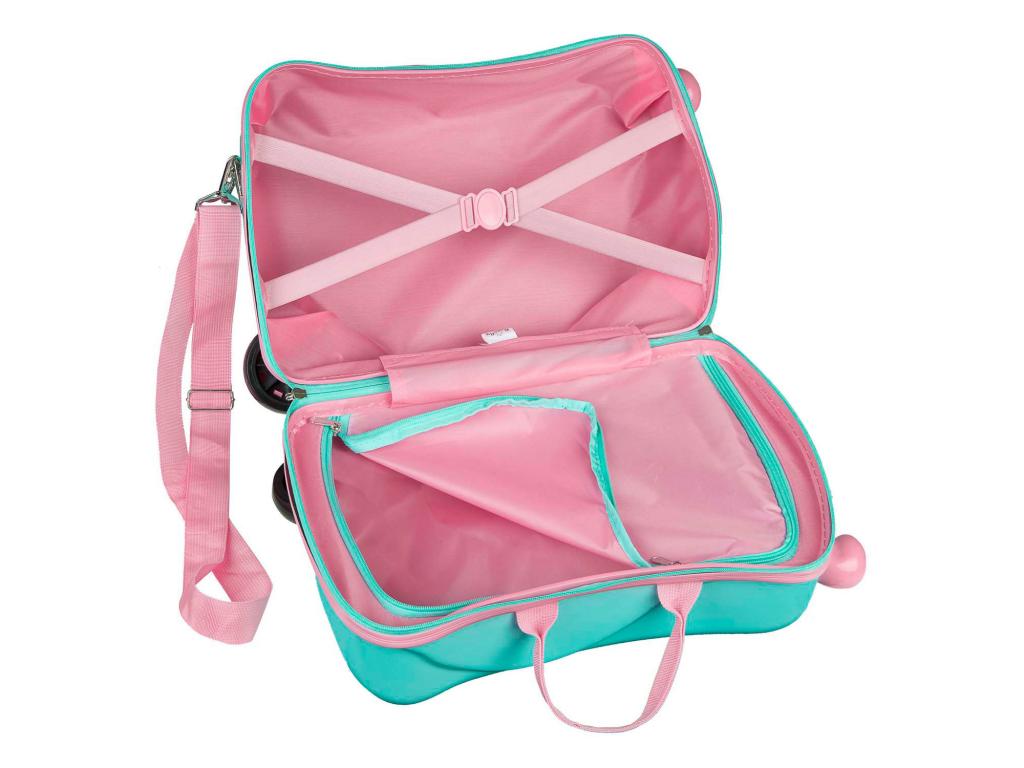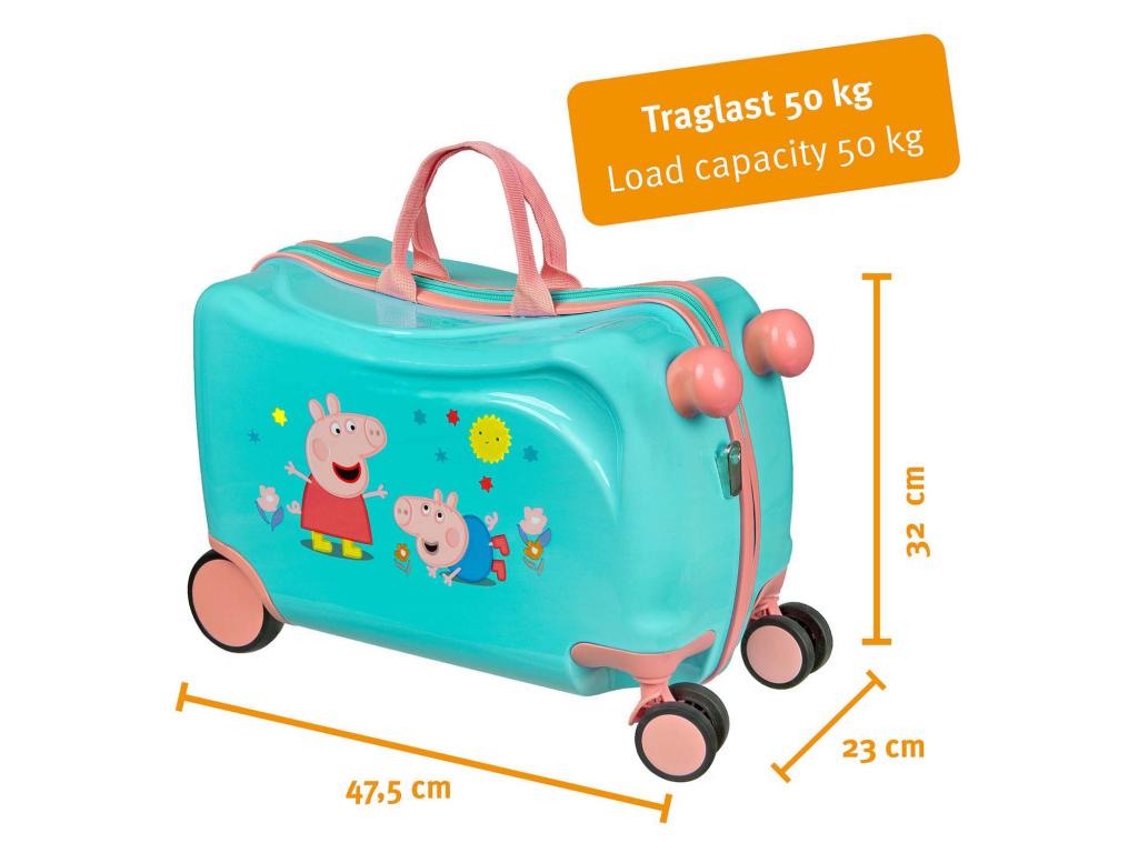 Peppa Malac ülőfunkcióval ellátott kerekes bőrönd gyerekeknek. A kék bőrönd rendkívül strapabíró, és rendelkezik hordozófogantyúval, valamint vállpánttal/húzópánttal. Belsejében két rekesz található, az egyik gumiszalaggal, a másik zárható cipzárral. Maximális ajánlott teherbírás: 50 kg. Méretek: 41,5 x 21 x 31 centiméter.