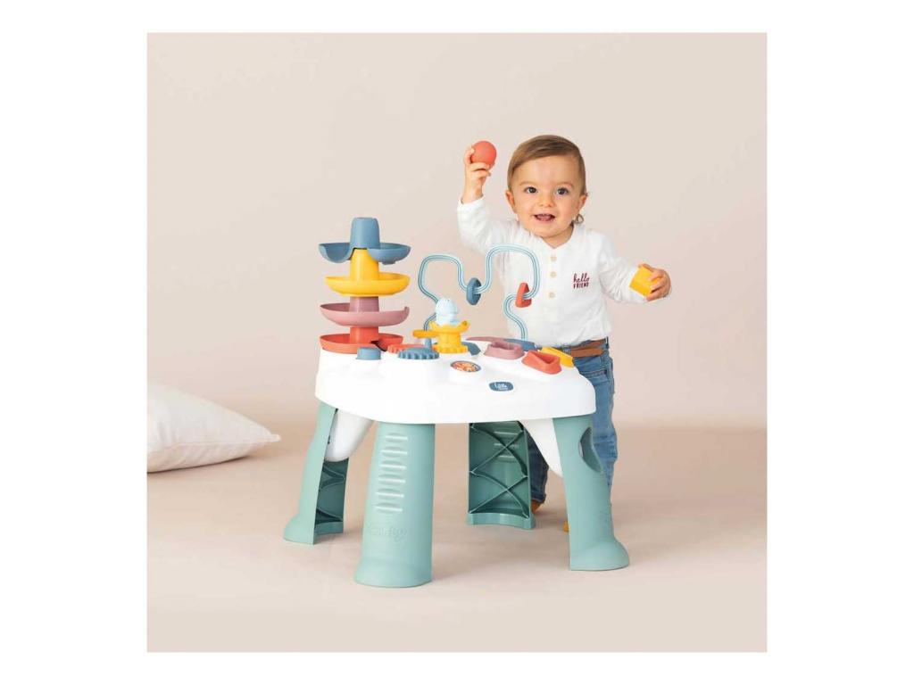Interaktív műanyag tevékenységi asztal formaválogatóval, fogaskerekekkel, gyöngyspirállal és labdajátékkal. 12 hónaposnál idősebb gyermekek számára alkalmas. Fejleszti a motorikus képességeket, a koordinációt és a logikai gondolkodást.