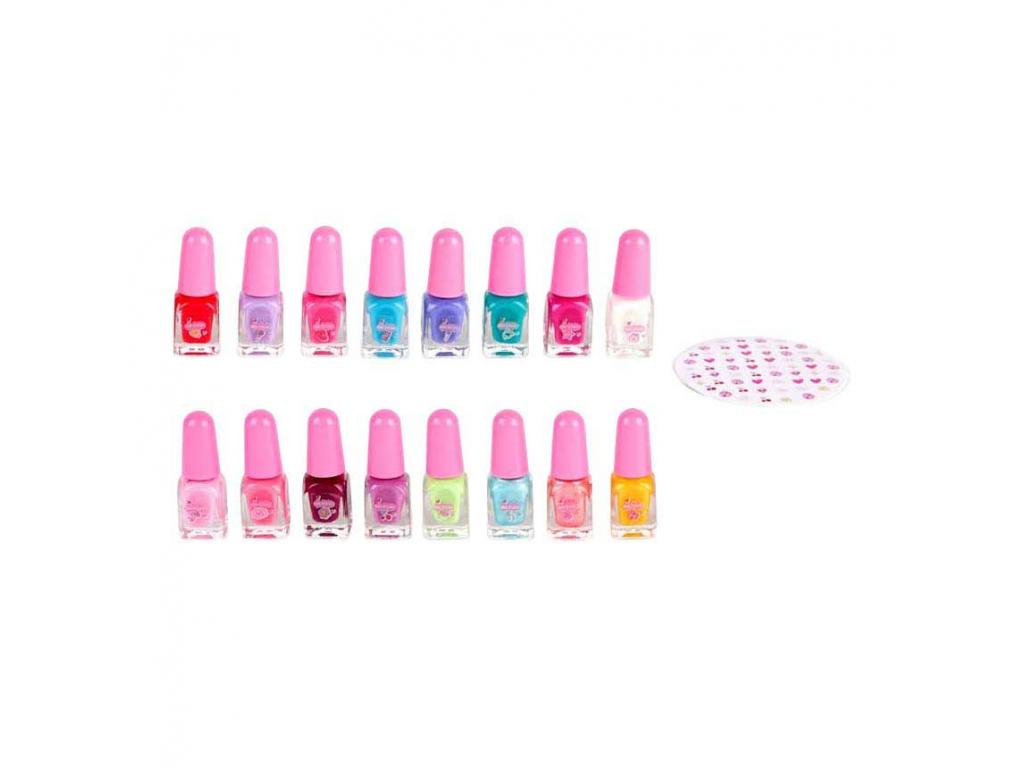Teljes körű körömlakk szett 16 különböző színnel és vicces köröm matricákkal. Műanyagból és üvegből. 6 éves kortól alkalmas.