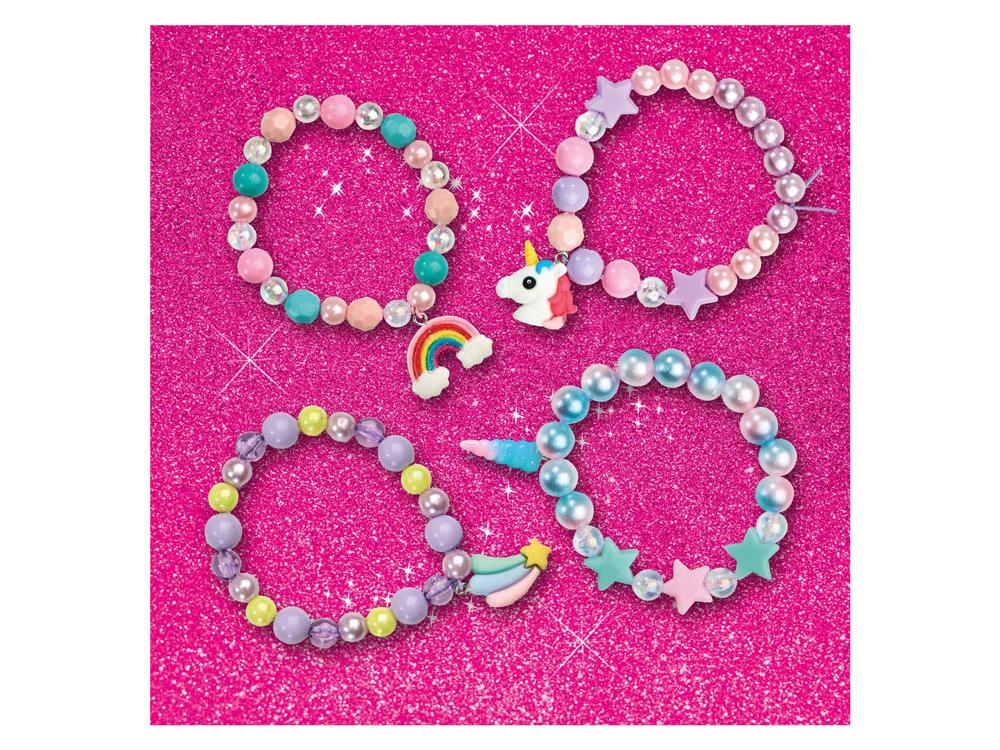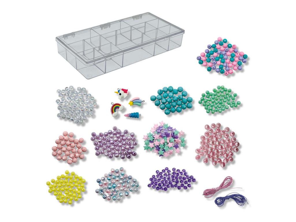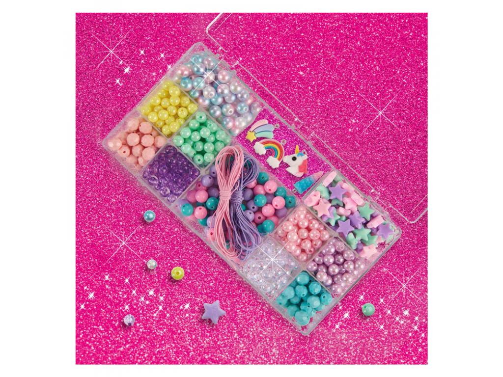 Készítsd el saját, egyedi egyszarvú ékszereidet az egyszarvú ékszergyöngy készlettel! Ez a 12 rekeszes átlátszó gyöngydoboz gyönyörű pasztellszínű és gyöngyházfényű gyöngyökkel van tele, köztük rózsaszín és kék gyöngyökkel, csillagokkal és négy elbűvölő egyszarvú medállal, amelyek különlegessé teszik alkotásaidat. Tökéletes azoknak a gyerekeknek, akik szeretnek kézműveskedni és ékszereket készíteni!