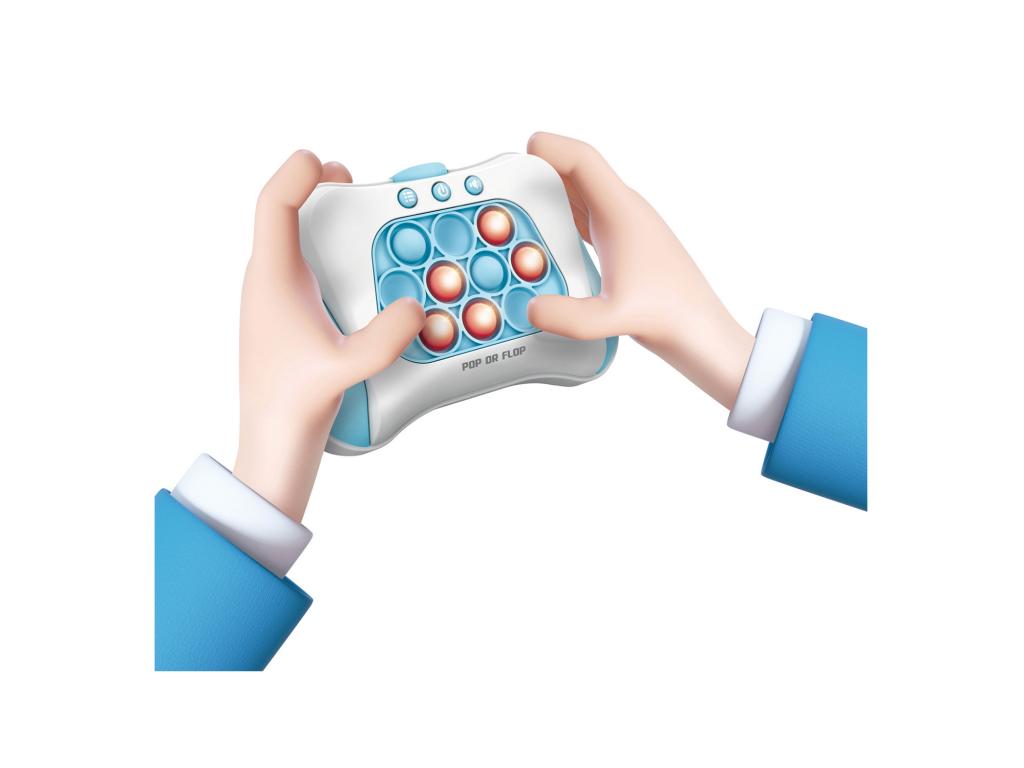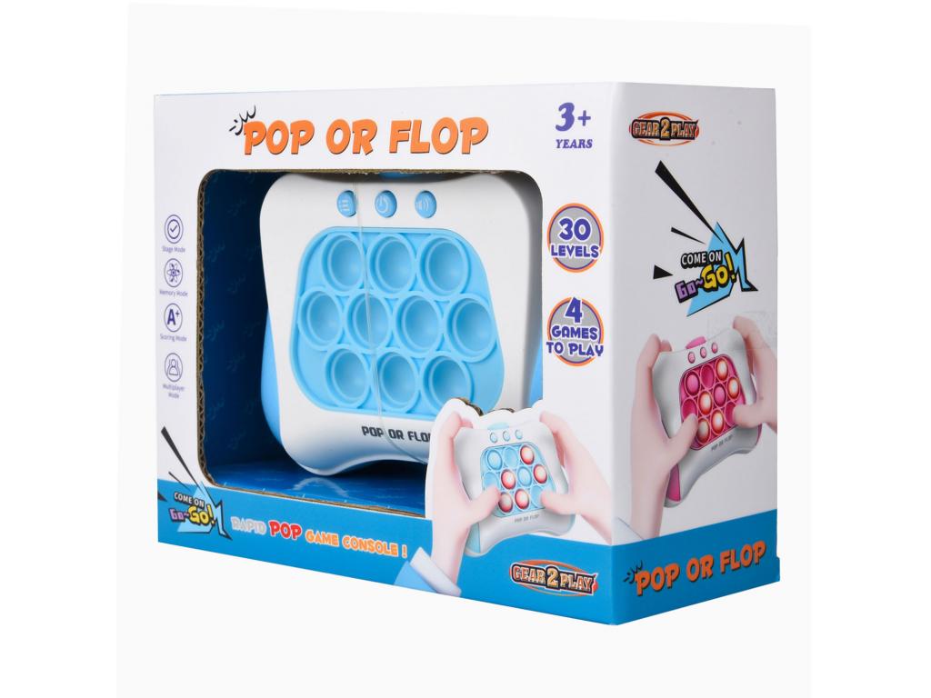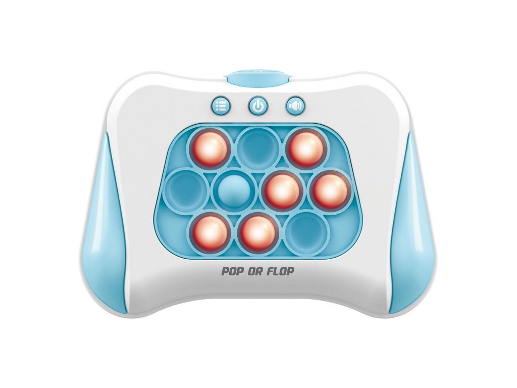 Javítsd reflexeidet ezzel a kék, hordozható Pop vagy Flop játékkonzollal, amely 4 különböző elektronikus Pop-it játékkal és 30 szinttel rendelkezik. A játékkonzol 10 gombja mindig egy meghatározott mintázat szerint világít. A cél az, hogy a lehető leggyorsabban megnyomd a világító gombot. Ezután nyomja meg a hátsó gombokat, mire a következő kombináció megjelenik a konzolon.