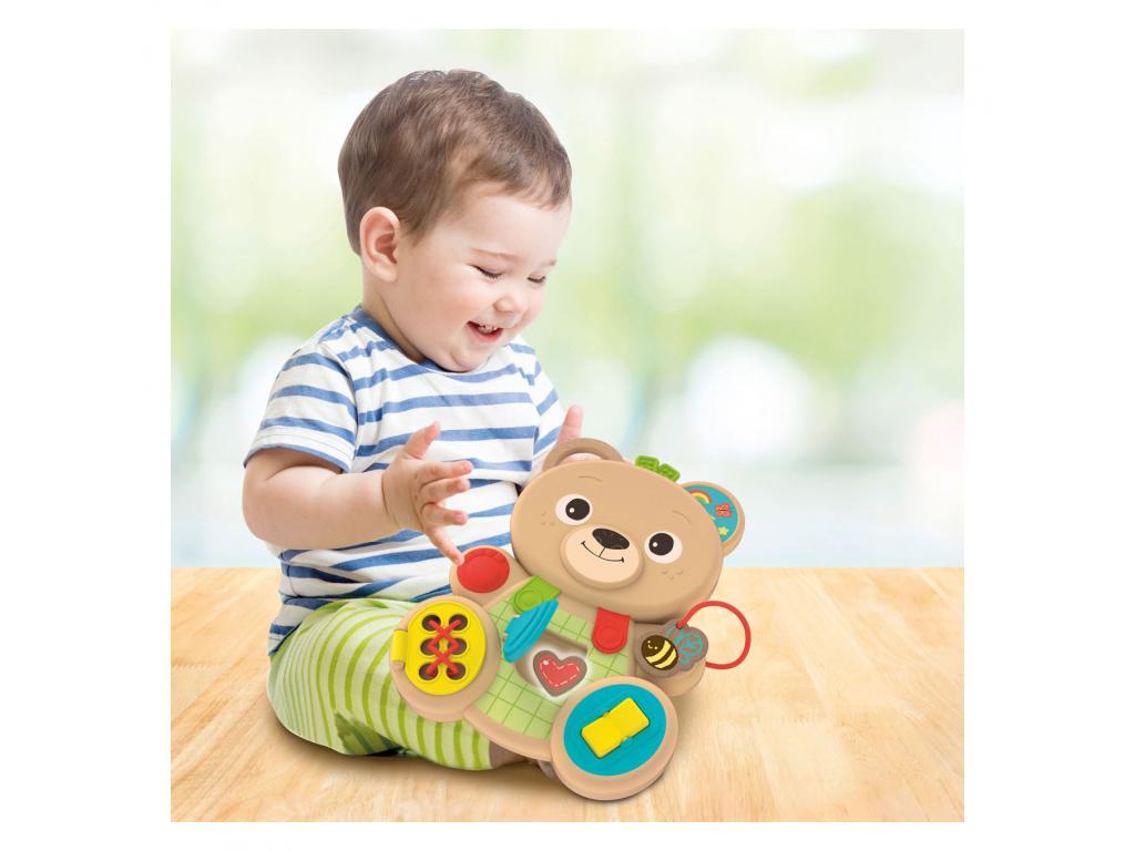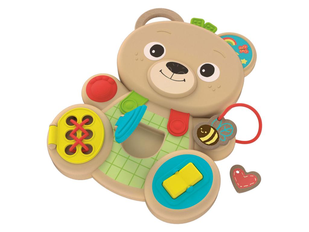 Vidám medve, különböző anyagokból készült elemekkel és sok felfedezésre váró tevékenységgel. A játékok a Montessori pedagógiai elveken alapulnak, rengeteg mechanizmussal és tevékenységgel, amelyek fejlesztik a gyermek kézügyességét és koncentrációs képességét. A különböző anyagoknak köszönhetően a medve stimulálja az érzékeket és segít a gyermeknek megtanulni a mindennapi tárgyak kezelését. 12 hónapos kortól alkalmas.