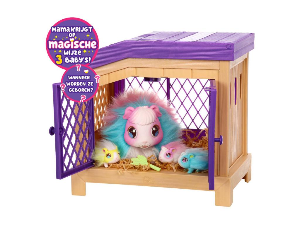 Elég szeretettel és figyelemmel Mama szíve ragyogni fog, és kiadja azt a különleges hangot, amely jelzi, hogy baba van úton! Tedd be a ketrecbe, és a bejárati ajtó felett egy kis dobogó szív fog világítani. Most várni kell, amíg Mama készen áll a baba megszületésére... Amint a szív fénye kialszik, varázslatos módon egy kis tengerimalac baba születik! Ezenkívül egy személyre szabott ápolási csomagot is találsz, amelyben születési anyakönyvi kivonat, hajdíszek és vicces szemüvegek vannak, hogy stílusosan öltöztethesd a tengerimalac babádat. 3 különböző tengerimalac baba születhet. A szülés újra és újra megismételhető, így a gyerekek újra és újra átélhetik az örömöt, hogy gondoskodnak anyukáról és felfedezik a babáit!