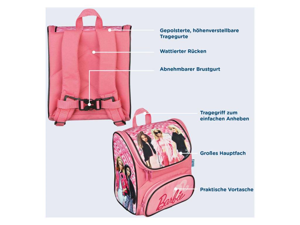 Kompakt kisgyermek hátizsák Barbie nyomtatással, mérete kb. 22 x 24 x 16 cm, 6,5 literes űrtartalommal. A hátizsák párnázott vállpántokkal, mellpánttal és puha háttámla párnázattal rendelkezik. Ideális kisgyermekek számára utazáshoz.