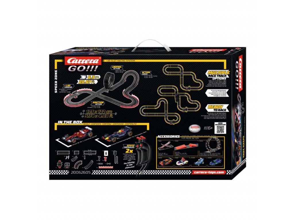 Carrera Go!!! F1 Speed Zone versenypálya. Jellemzők : A pálya hossza kb. 6,3 méter, 2 db Formula 1 versenyautó tartozik hozzá, méretarány 1:43, 6 éves kortól, hálózati üzemmód (adapter a csomagban található).