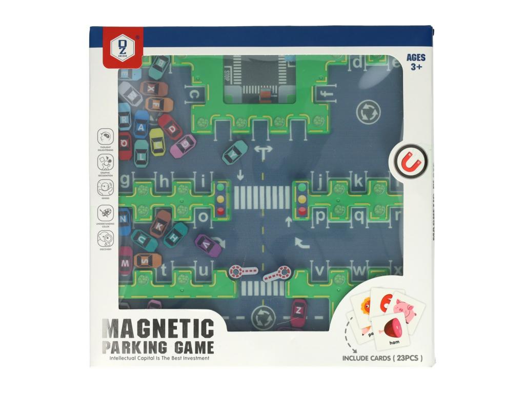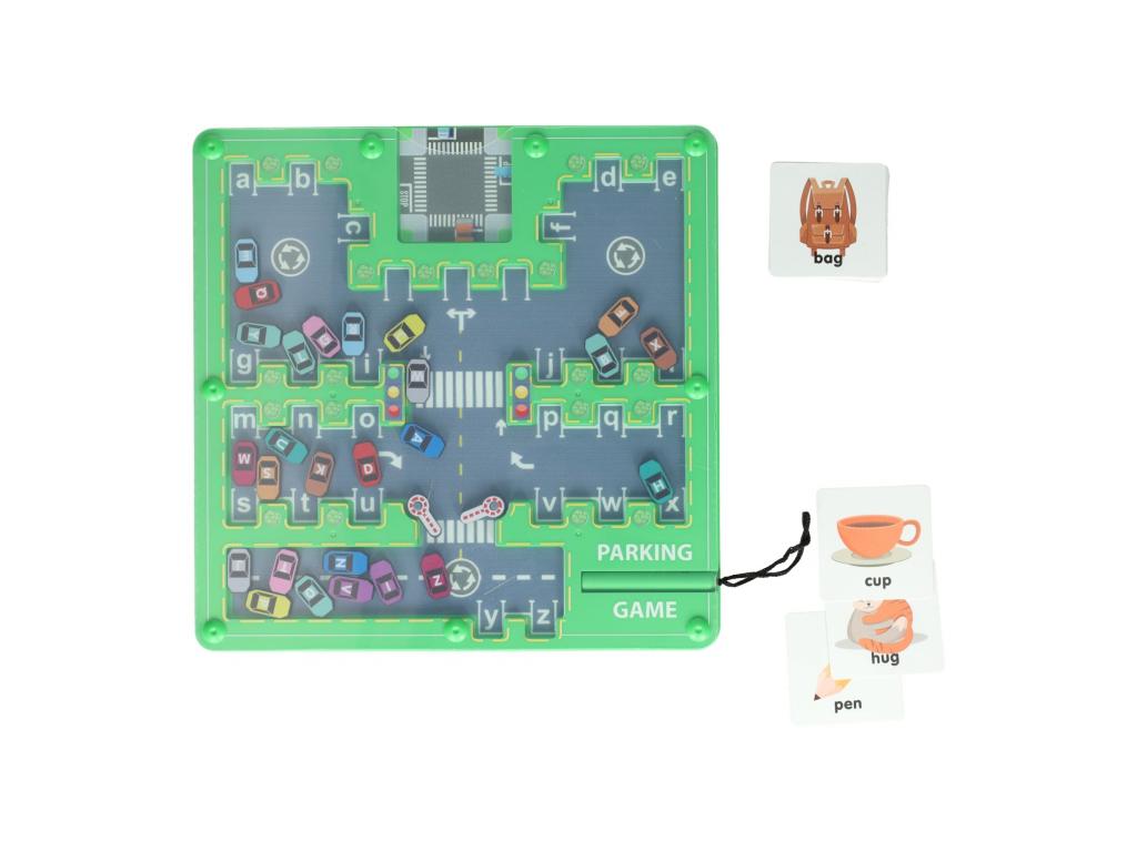 Mágneses parkolós játék 26 autóval és 23 ábécékártyával az angol helyesírás elsajátításához. Mágneses pálcával, amely az autókat a megfelelő helyre vezeti. 3 éves kortól alkalmas.