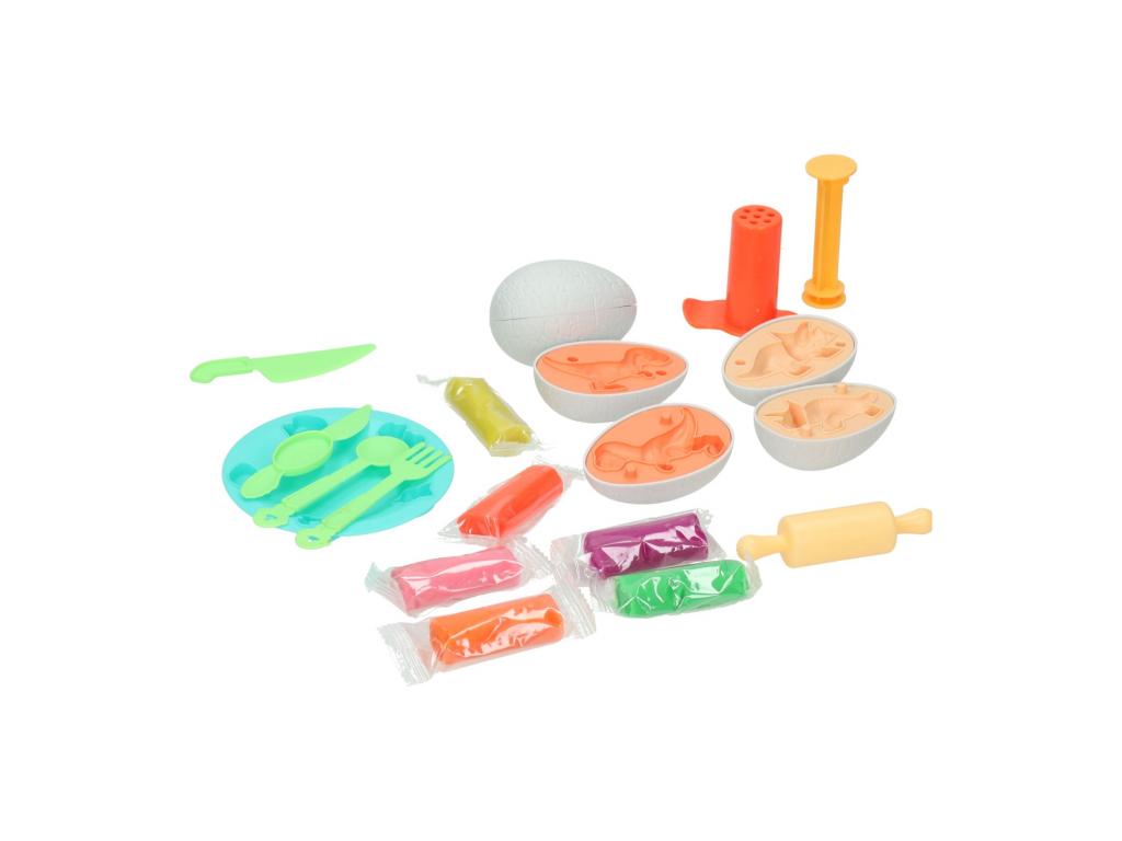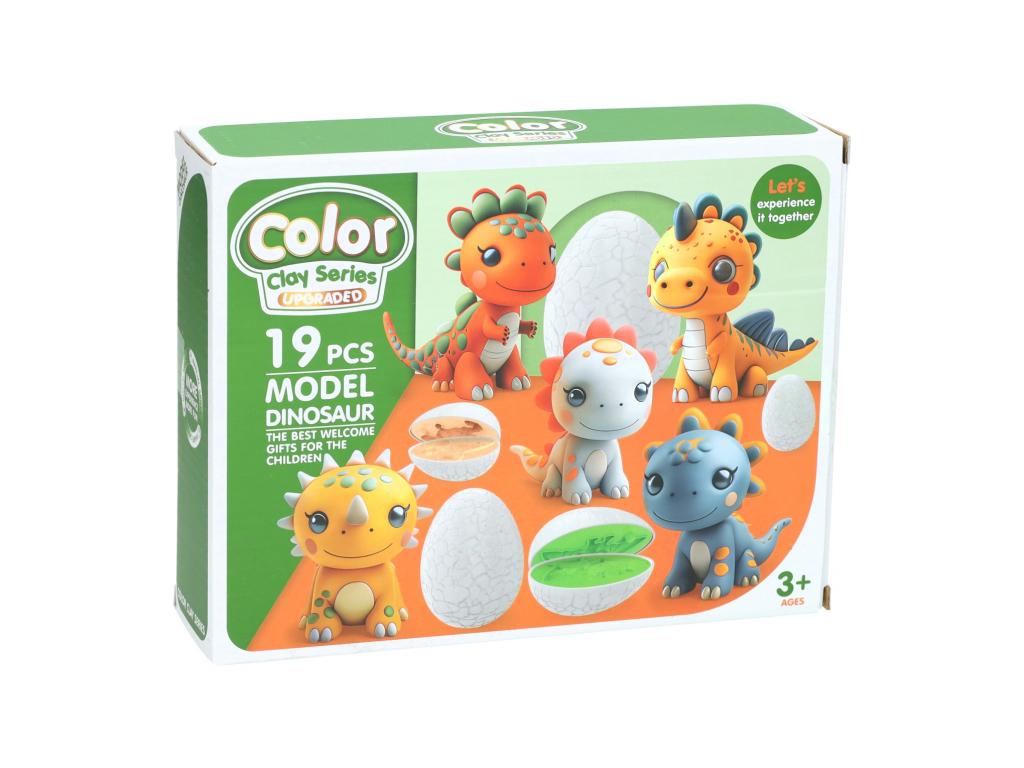 19 darabos dinoszaurusz játék szett, színes gyurmával, szerszámokkal és dinoszaurusz tojás formákkal. Műanyagból és gyurmából. 3 éves kortól alkalmas.