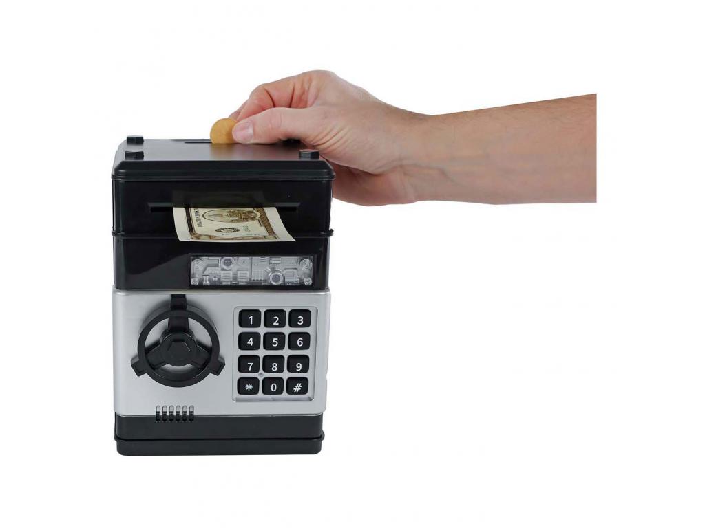 Széf alakú elektronikus persely titkos kóddal, fény- és hangjelzéssel, mérete: 19,5 cm, fekete. Csomagolás: 46 x 18 x 9 cm. 3 éves kortól ajánlott.