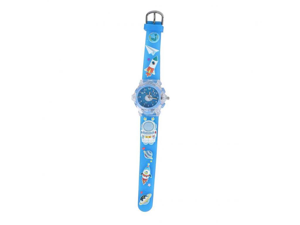 Világító analóg karóra világűr motívummal, kék. 3 év alatti gyermekek számára nem alkalmas. Méret: 23 x 1,8 cm
