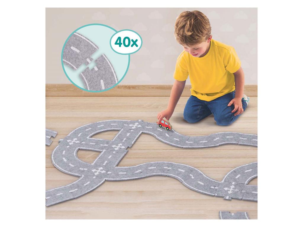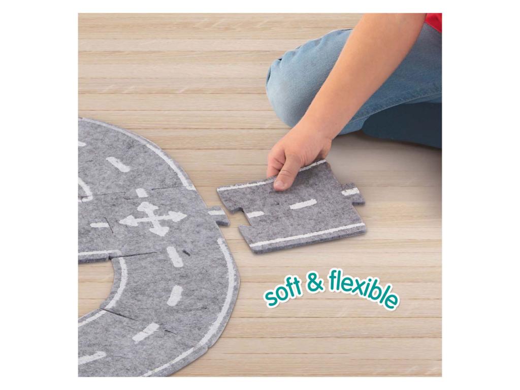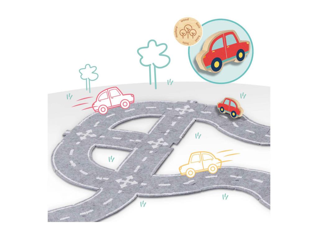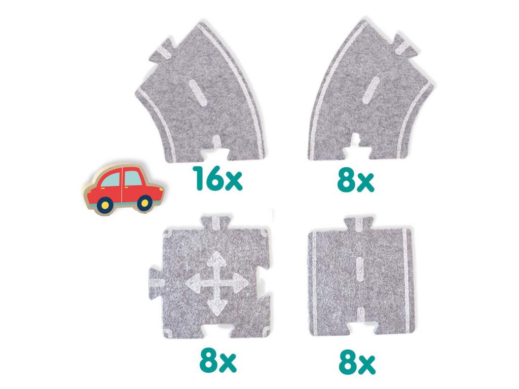 Építsd meg saját úthálózatodat a 40 darabos filc készletből! Ezekkel a vastag filc utakkal végtelenül variálhatsz és megalkothatod saját pályádat. A puzzle-elemek könnyen összerakhatók, így órákon át tartó játékélményt biztosítanak. A készletben egy szép fa autó található, de az utak minden ismert márka kis játékautóival is bejárhatók. Ezenkívül a készlet további 20 vagy 40 darabos készletekkel bővíthető, így még hosszabb utak is lehetségesek! Tökéletes azoknak a gyerekeknek, akik szeretnek építeni és játszani!