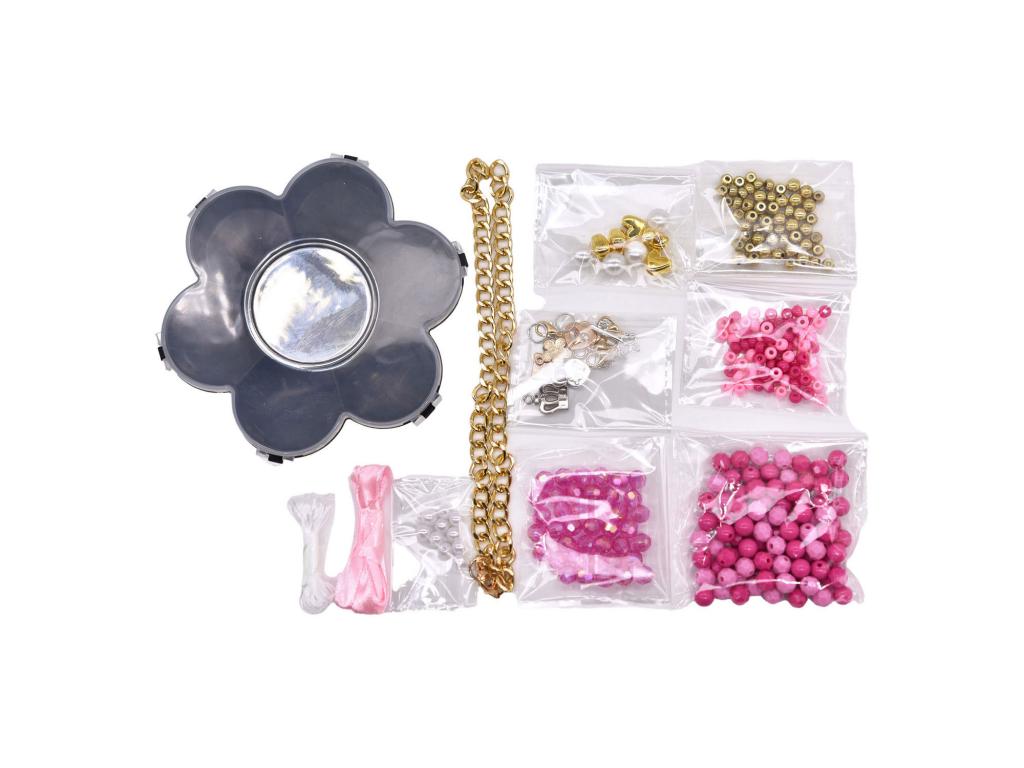 Ezzel az ékszerkészlettel saját nyakláncokat és karkötőket készíthetsz. Az arany lánckarkötővel, különböző medálokkal, gyöngyökkel és egy rózsaszín masnival sok egyedi darabot készíthetsz. A gyöngyök különböző formákban és méretekben kaphatók arany, lila, rózsaszín, fehér, sárga és kék színben. 6 éves kortól alkalmas.
