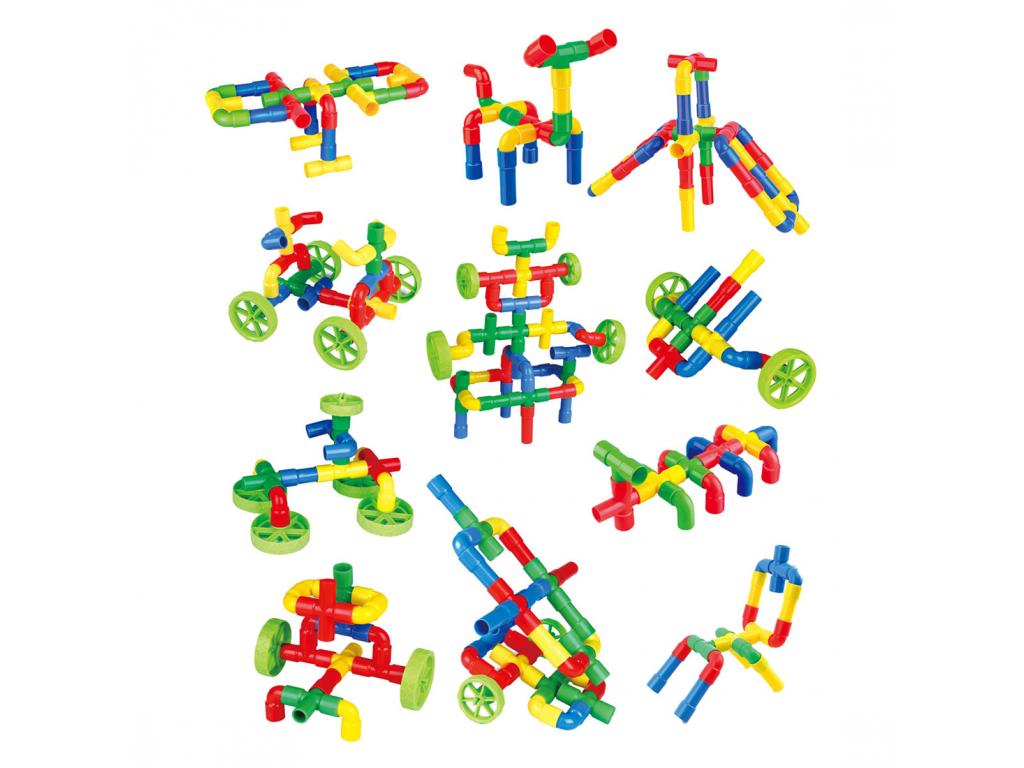 72 darab cső és kerék építőelem épületek és járművek építéséhez. 3 éves kortól alkalmas.