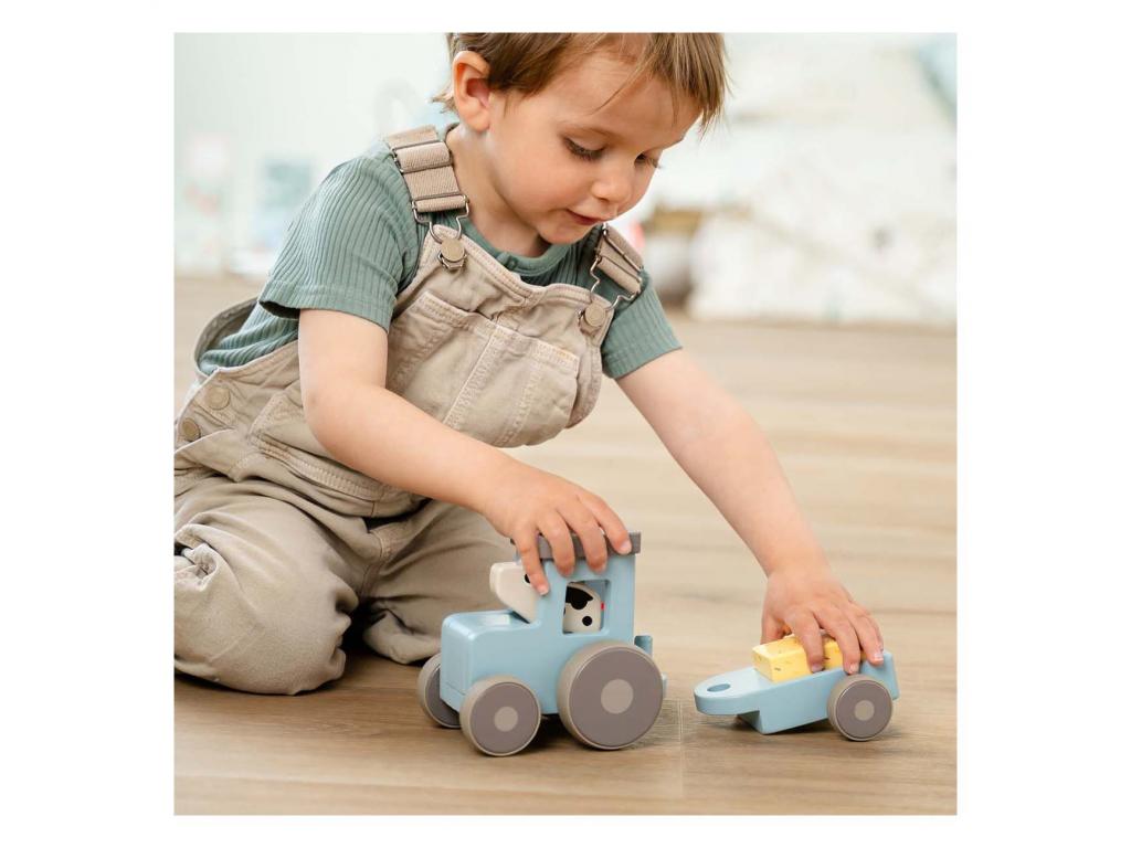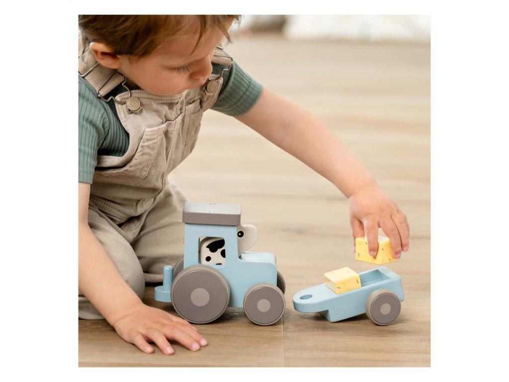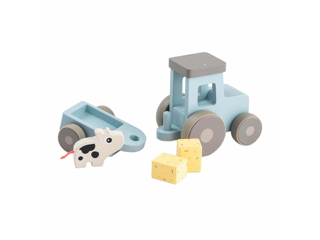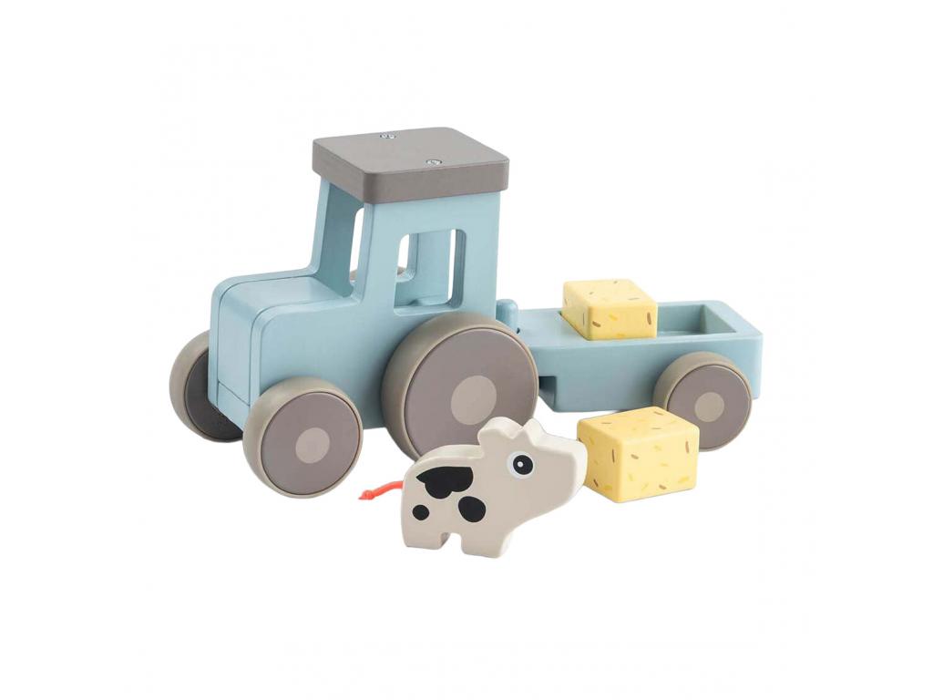 Kék Done by Deer fa traktor levehető pótkocsival, Dotti tehénnel mint sofőrrel, és két szénabálával.