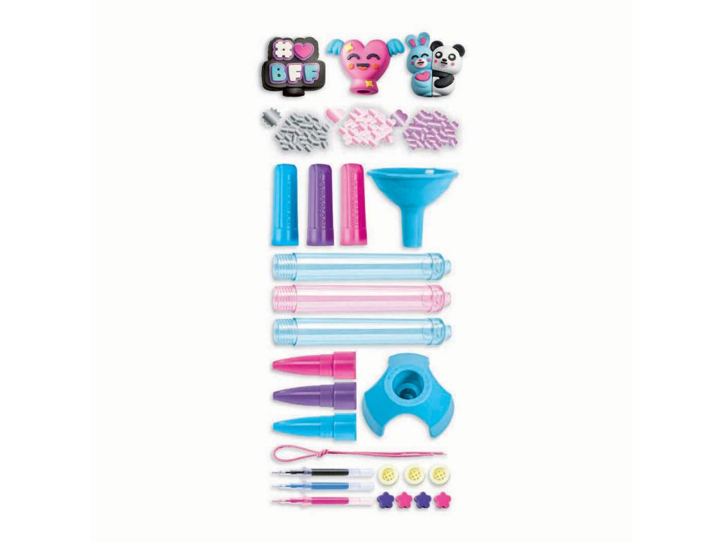 Eredeti készlet tollak tervezéséhez és személyre szabásához különböző díszítésekkel. Praktikus és átfogó készlet tollakkal, különböző tintaszínekkel, figurákkal és mindennel, amire szükség van a tervezéshez. Megtervezheted saját magad, és szabadjára engedheted fantáziád. Olaszországban fejlesztették és tervezték. 6 éves kortól ajánlott.