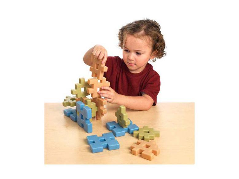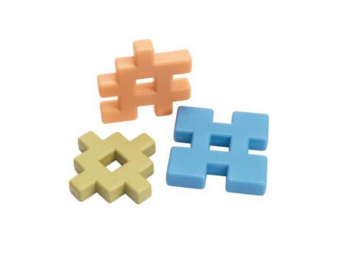 21 darabos szett kék, narancssárga és zöld színű gofri alakú blokkokból. Könnyű műanyagból, egyszerűen összekapcsolható elemek.