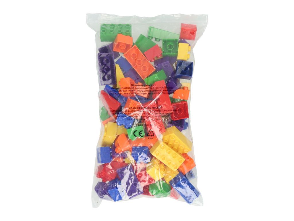 90 darab műanyag építőelem narancssárga, piros, kék, zöld, sárga és lila színben. Az építőelemek mérete kb. 3 x 3 cm-től 3 x 6,5 cm-ig változik.