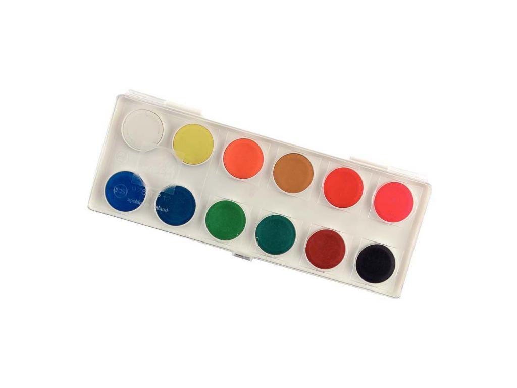 Tartalom: 12 színű vízfesték, homályoes/nem átlátszó árnyalatban. Mérete: 26 x 9 x 1 cm.