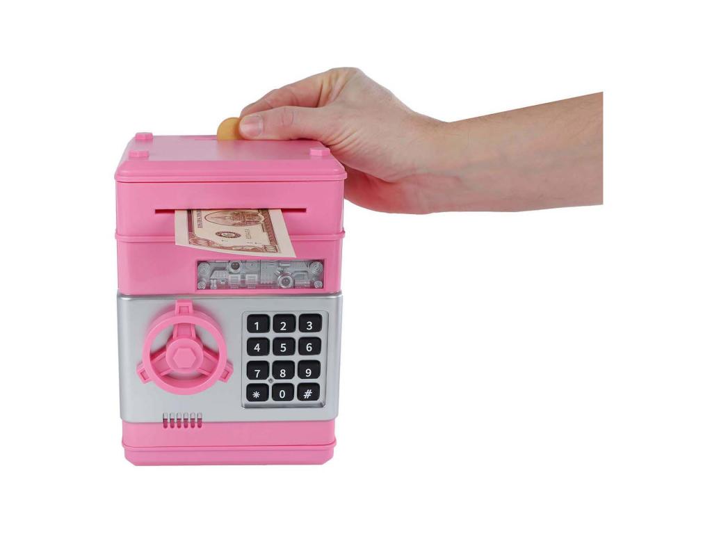 Széf alakú elektronikus persely titkos kóddal, fény- és hangjelzéssel, mérete: 19,5 cm, rózsaszín. Csomagolás: 46 x 18 x 9 cm. 3 éves kortól ajánlott.