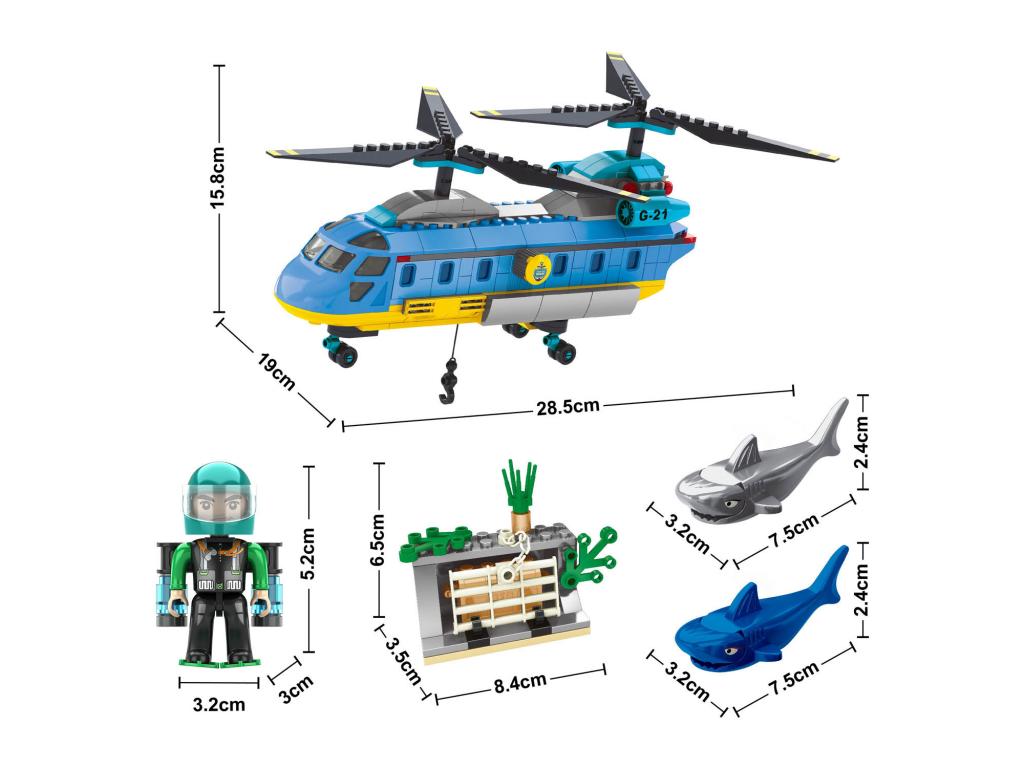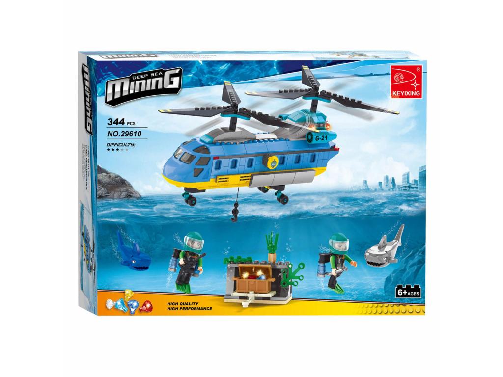 Készlet helikopterrel és további alkatrészekkel víz alatti misszióhoz. A helikopter mérete 28,5 x 19 x 15,8 centiméter, a teljes készlet 344 darabot tartalmaz. 6 éves kortól alkalmas.