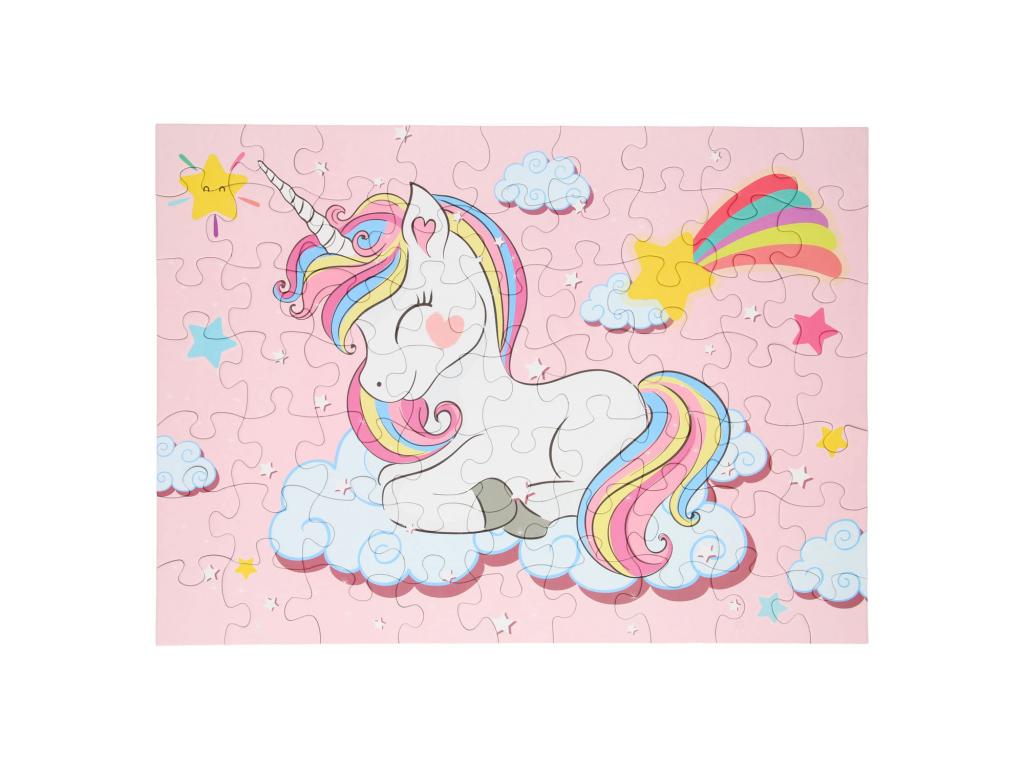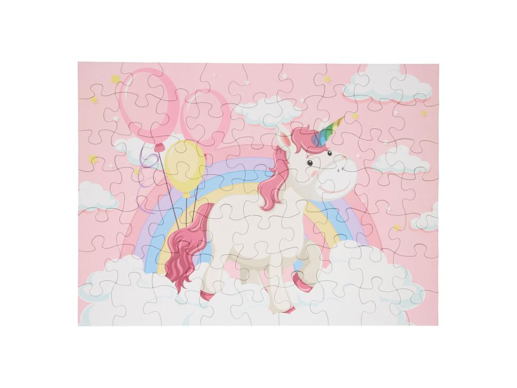 63 darabos karton egyszarvú puzzle. Összeszerelve a puzzle mérete 52 x 38 centiméter. 3 éves kortól alkalmas.