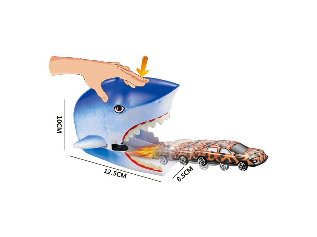 Cápás kezdő szett, tigrises nyomtatással ellátott autóval. Az autó a cápa szájának összenyomásával indítható el. A cápa mérete 12,5 x 8,5 x 10 centiméter, 3 éves kortól alkalmas.