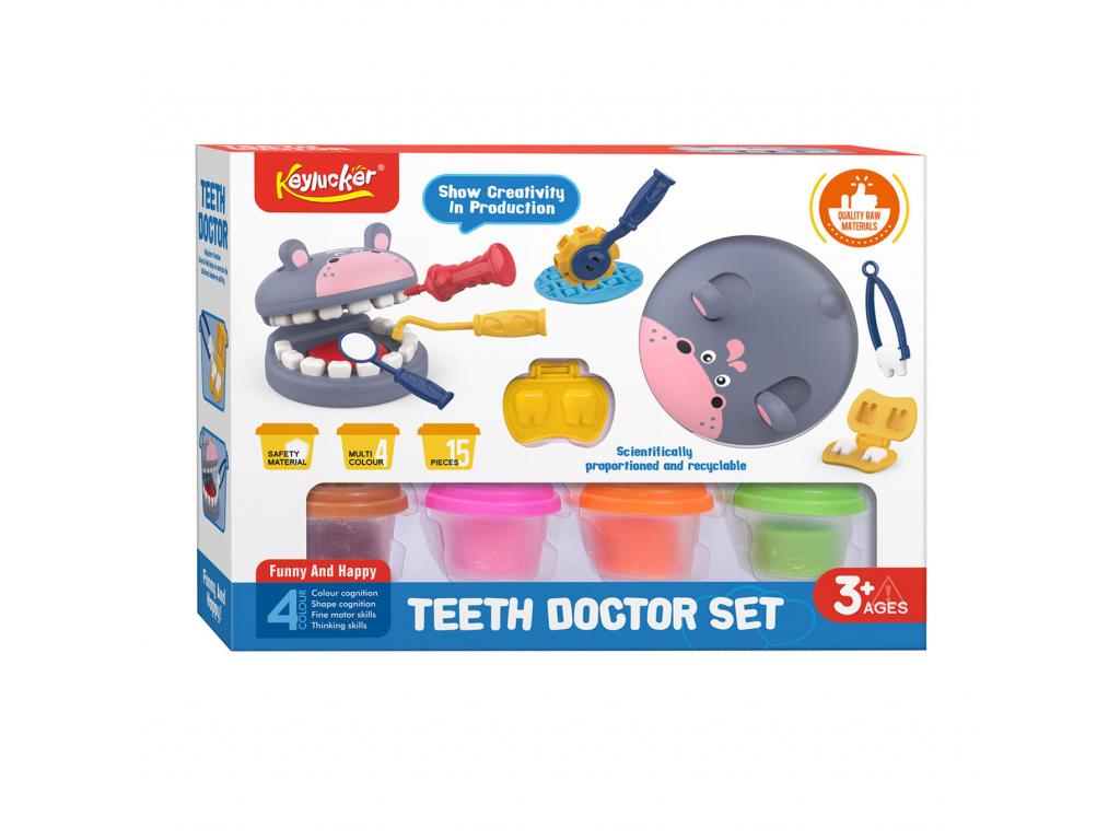 Gyurmakészlet egy fogorvoshoz tartó vízilóval, és különböző fogászati gyurmaeszközökkel. A 15 darabos készlet négy színű gyurmát tartalmaz. 3 éves kortól alkalmas.