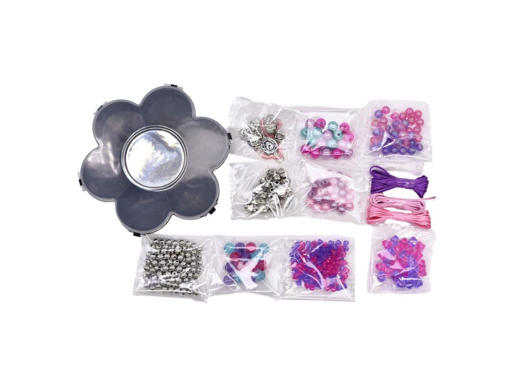 Ezzel az ékszerkészlettel saját nyakláncokat és karkötőket készíthetsz. Különböző formájú és méretű gyöngyöket tartalmaz ezüst, lila, rózsaszín és kék színben. 6 éves kortól alkalmas.