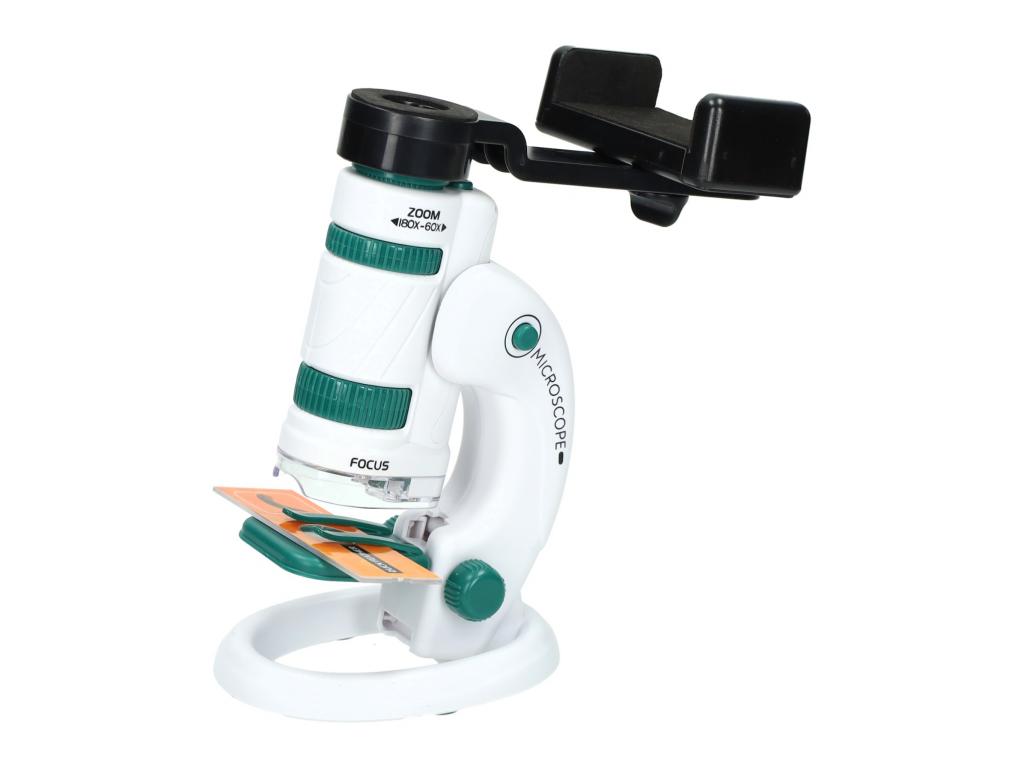 Hordozható mikroszkóp szett 60-180-szoros nagyítással, műanyagból. Tartalmaz okostelefon-tartót, mintákat, tárgylemezeket és kiegészítőket. 6 éves kortól alkalmas. Egy AAA-elem és három AG3-elem szükséges (nem tartozék).