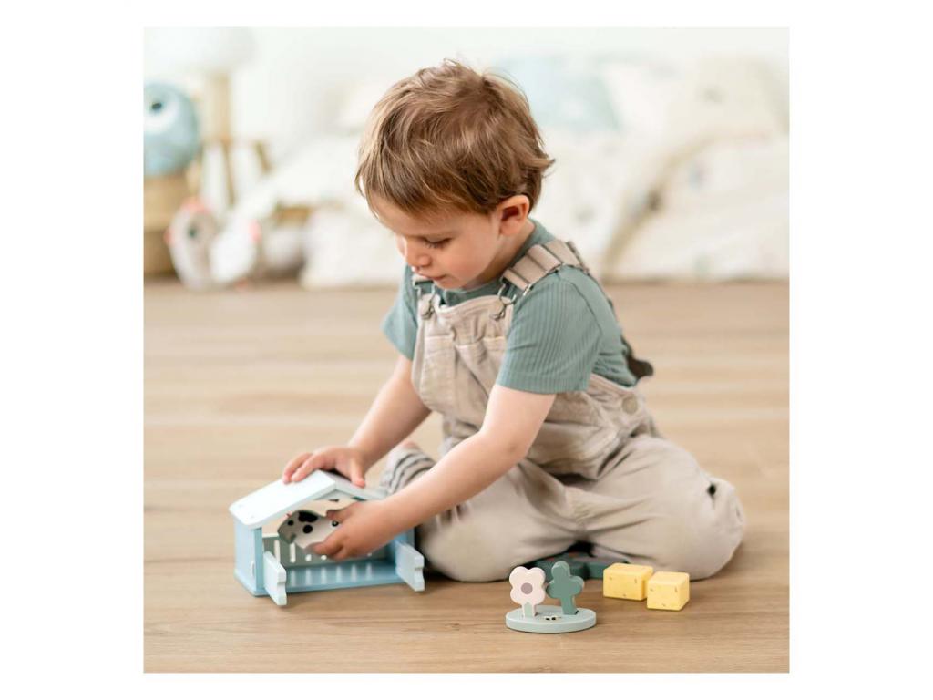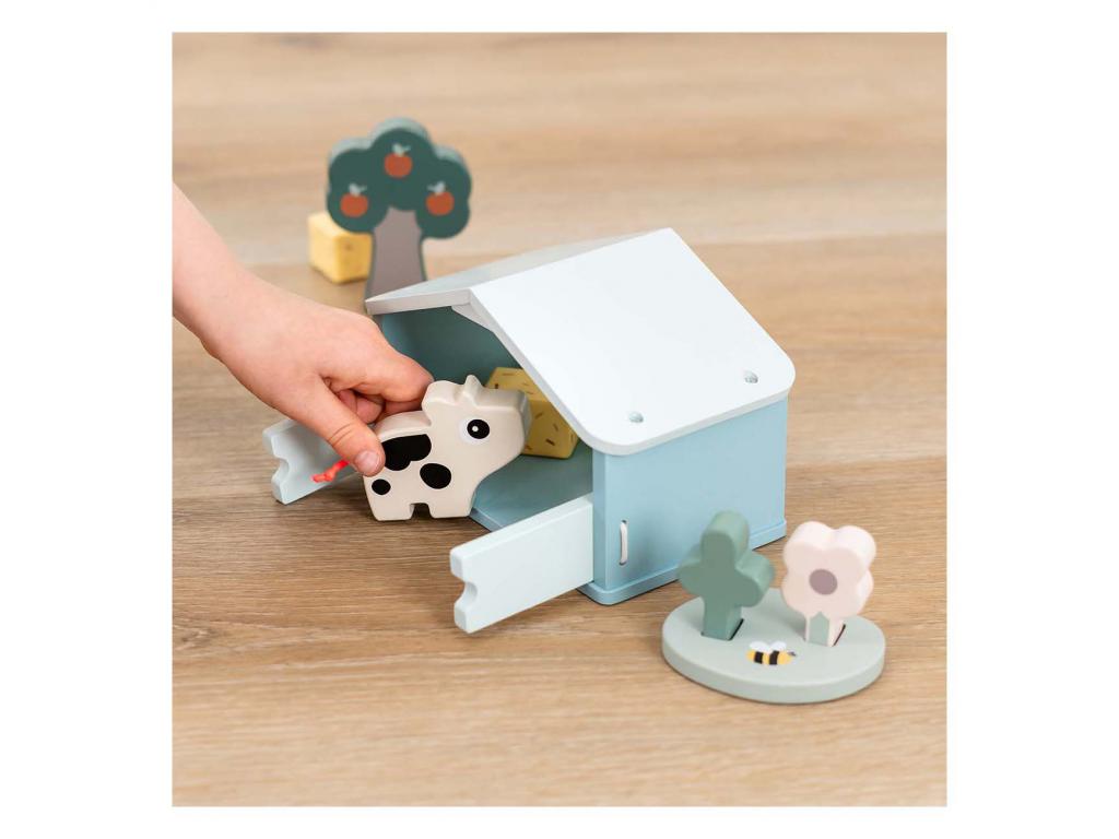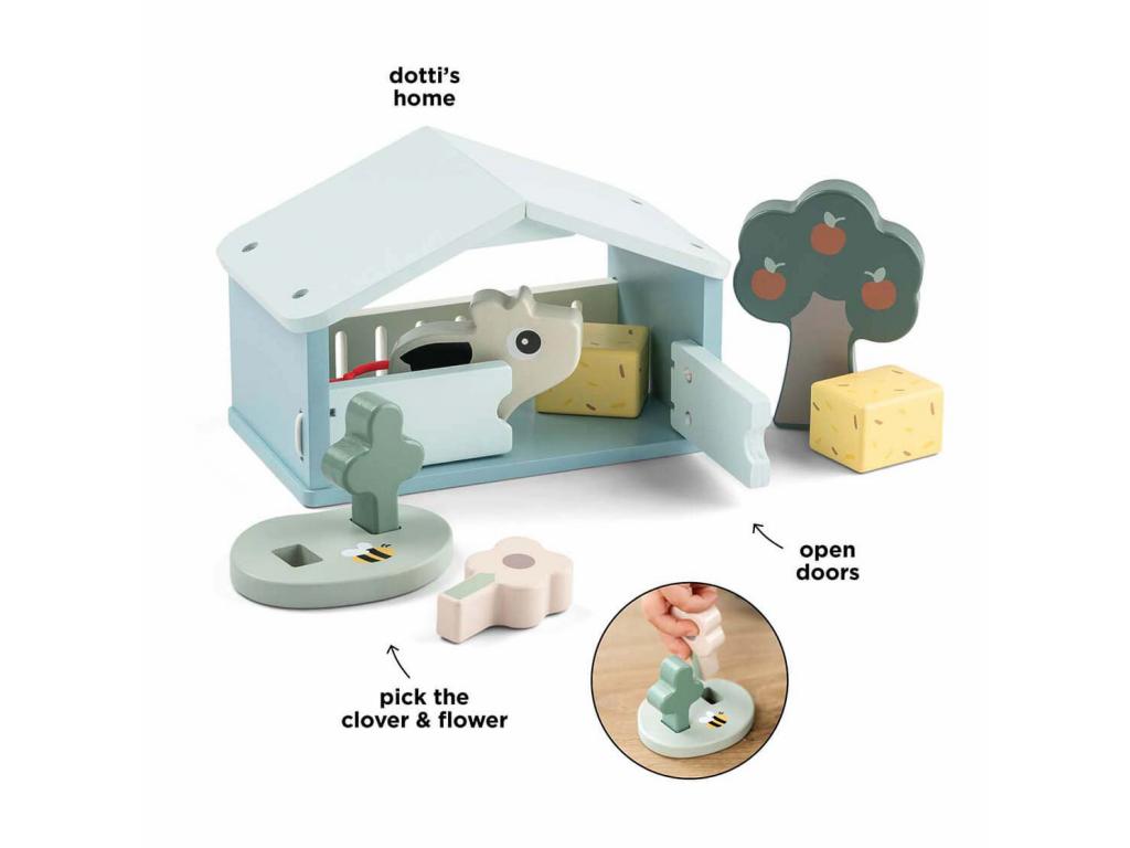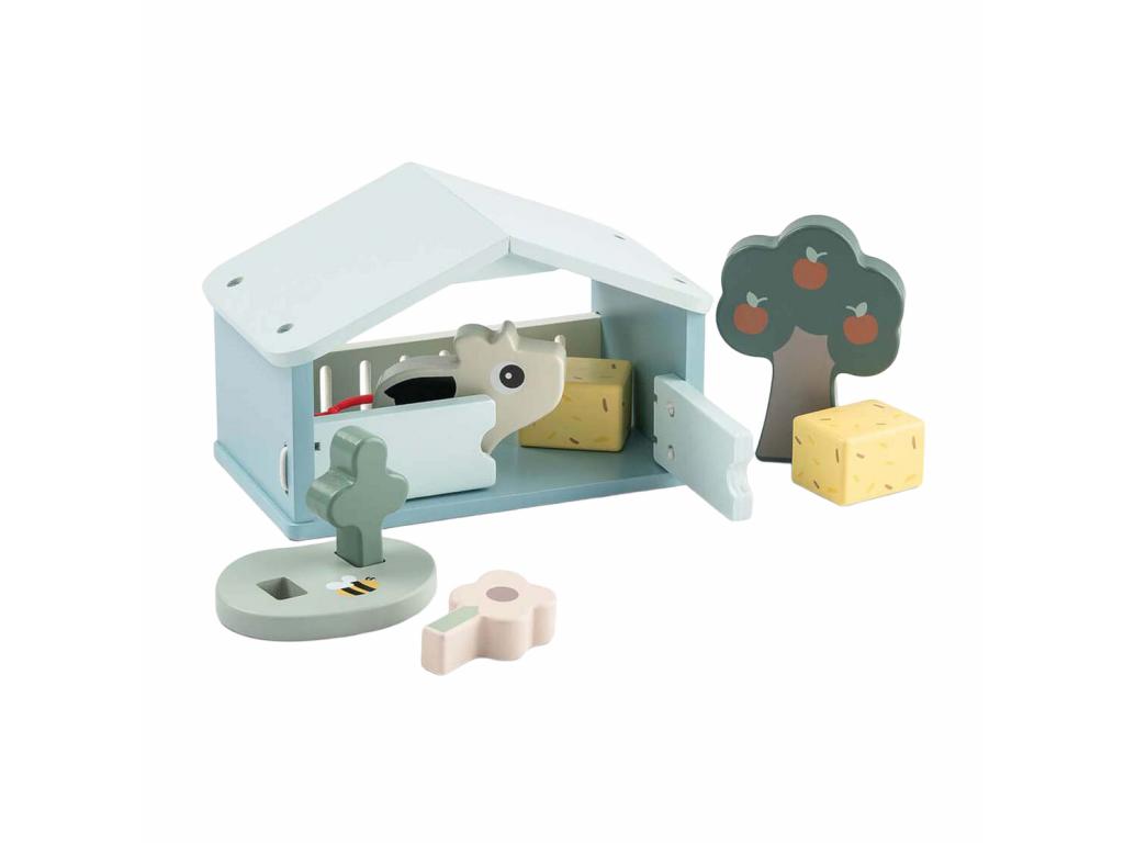 Done by Deer fa játék szett Dotti tehénnel, istállóval, almafával, szénabálával, virággal és lóherével. Szárnyas ajtókkal. 2 éves kortól alkalmas.
